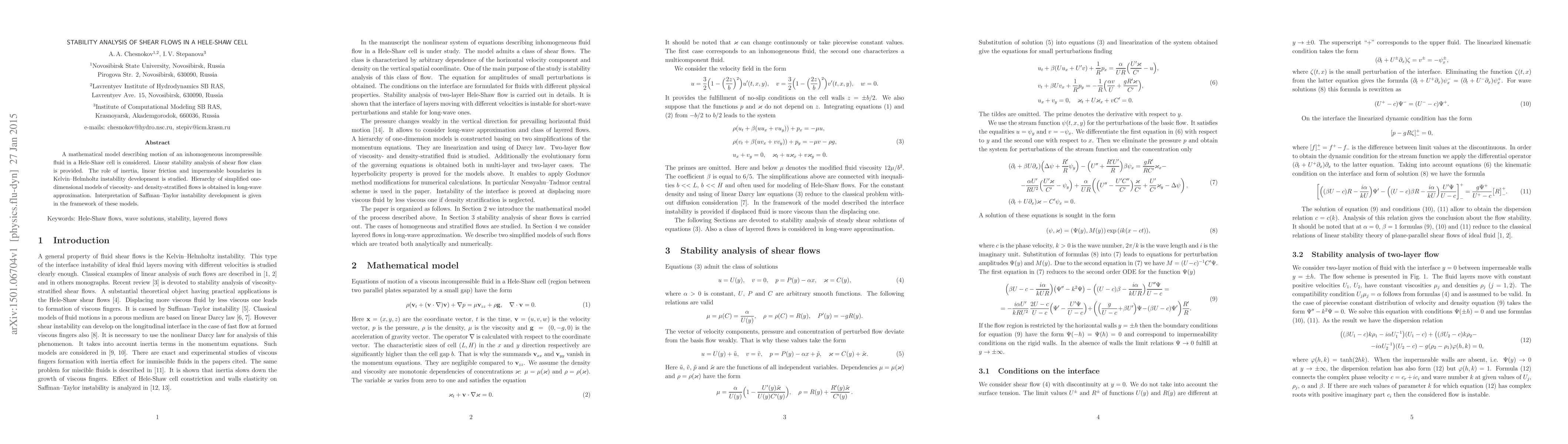 A mathematical model describing motion of an inhomogeneous incompressible fluid in a Hele-Shaw cell is considered. Linear stability analysis of shear flow class is provided. The role of inertia, linear friction and impermeable boundaries in Kelvin--Helmholtz instability development is studied. Hierarchy of simplified one-dimensional models of viscosity- and density-stratified flows is obtained in long-wave approximation. Interpretation of Saffman--Taylor instability development is given in the framework of these models.