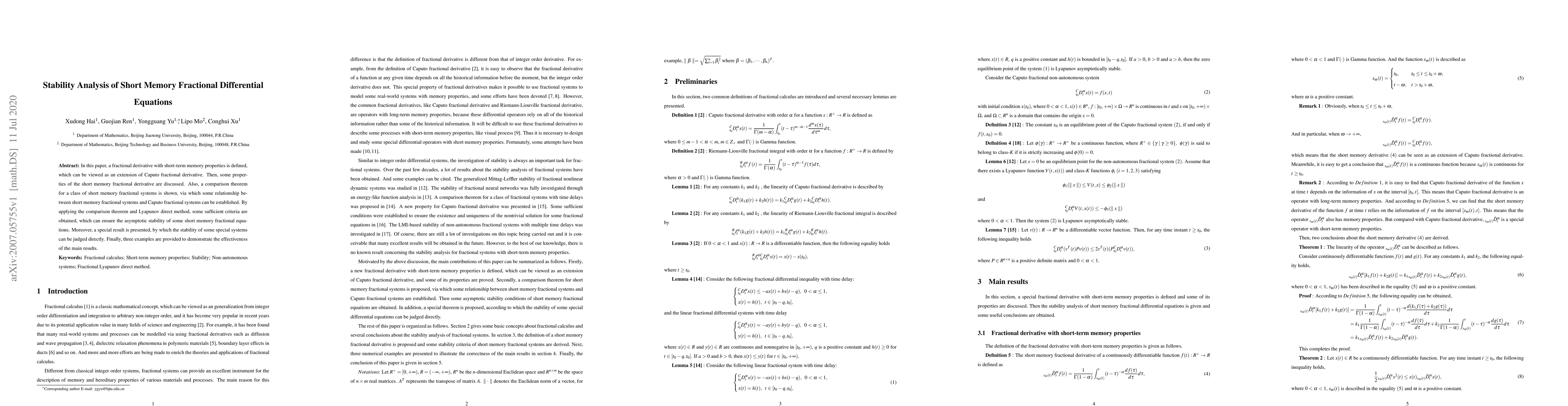 This paper defines a short memory fractional derivative and explores its properties, establishing a comparison theorem to relate it to Caputo fractional systems. It provides sufficient criteria for asymptotic stability using the comparison theorem and Lyapunov method, and concludes with three examples to validate the findings.