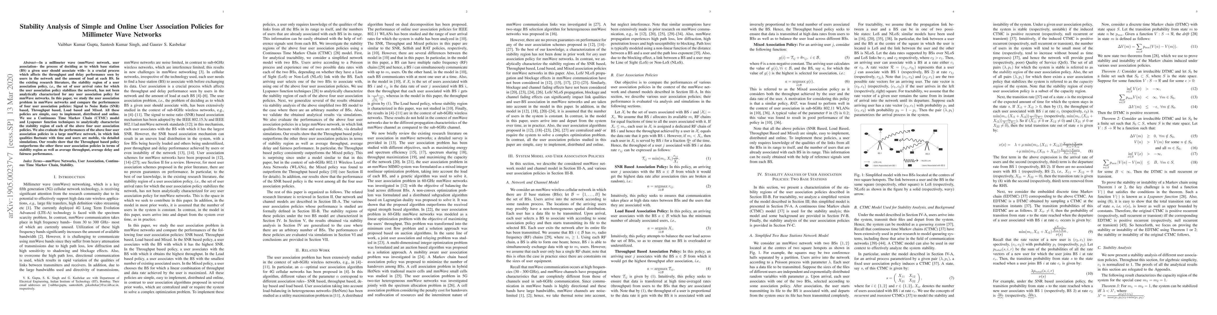 In a millimeter wave (mmWave) network, user association, the process of deciding as to which base station (BS) a given user should associate with, is a crucial process which affects the throughput and delay performance seen by users in the network and the amount of load at each BS. In the existing research literature, the stability region of a user association policy, i.e., the set of user arrival rates for which the user association policy stabilizes the network, has not been analytically characterized for any user association policy for mmWave networks. In this paper, we study the user association problem in mmWave networks and compare the performance of four user association policies: Signal to Noise Ratio (SNR) based, Throughput based, Load based and Mixed. All these policies are simple, easy to implement, distributed and online. We use a Continuous Time Markov Chain (CTMC) model and Lyapunov function techniques to analytically characterize the stability region of each of the above four user association policies. We also evaluate the performance of the above four user association policies in a large mmWave network, in which link qualities fluctuate with time and users are mobile, via detailed simulations. Our results show that the Throughput based policy outperforms the other three user association policies in terms of stability region as well as average throughput, average delay and fairness performance.