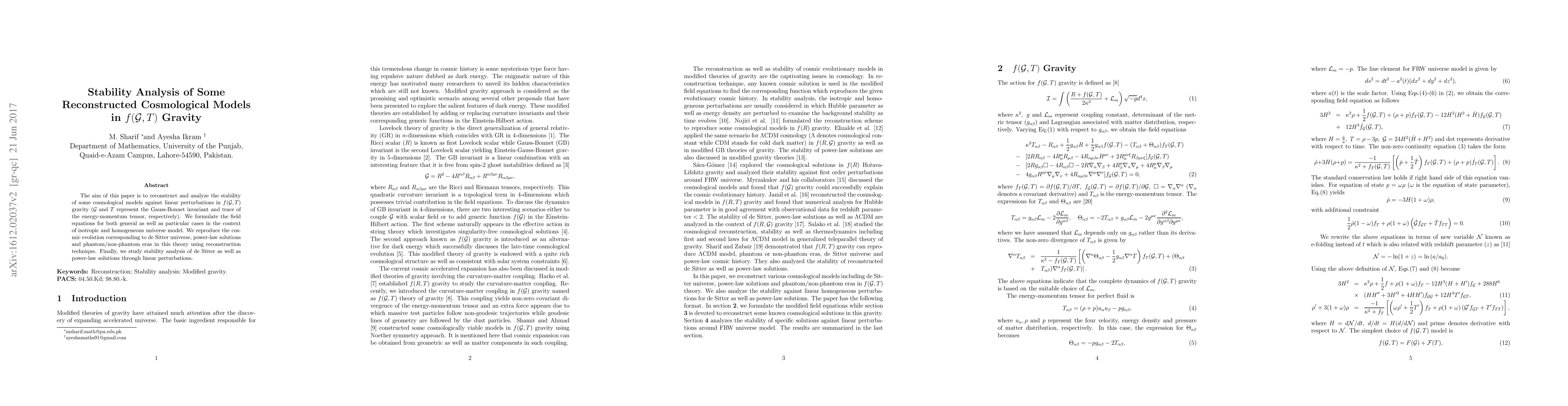 The aim of this paper is to reconstruct and analyze the stability of some cosmological models against linear perturbations in $f(\mathcal{G},T)$ gravity ($\mathcal{G}$ and $T$ represent the Gauss-Bonnet invariant and trace of the energy-momentum tensor, respectively). We formulate the field equations for both general as well as particular cases in the context of isotropic and homogeneous universe model. We reproduce the cosmic evolution corresponding to de Sitter universe, power-law solutions and phantom/non-phantom eras in this theory using reconstruction technique. Finally, we study stability analysis of de Sitter as well as power-law solutions through linear perturbations.