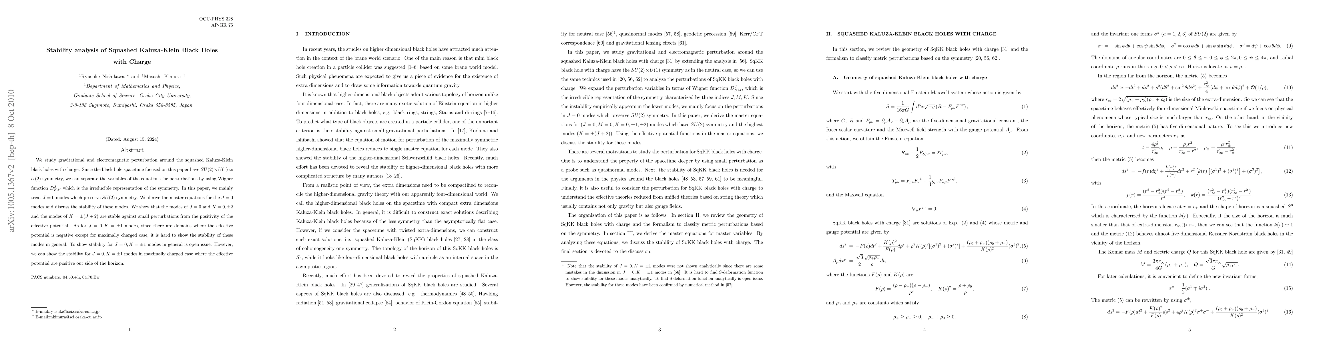This paper investigates the stability of squashed Kaluza-Klein black holes with charge under gravitational and electromagnetic perturbations, focusing on $SU(2) \times U(1)$ symmetric modes. The $J=0$ modes are shown to be stable, while $J = 0, K=\pm 1$ modes remain an open issue for general cases, though stability is confirmed in maximally charged scenarios.