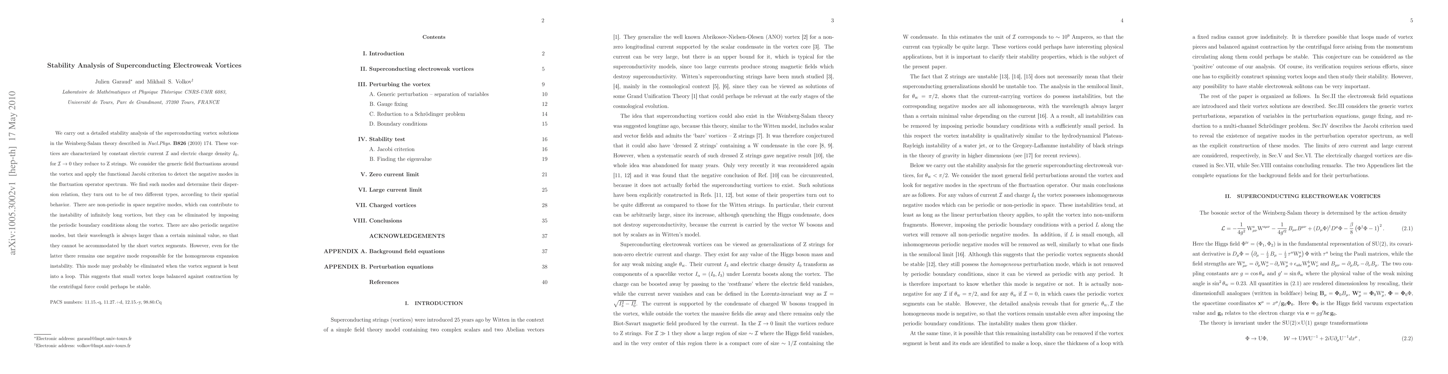 We carry out a detailed stability analysis of the superconducting vortex solutions in the Weinberg-Salam theory described in Nucl.Phys. B826 (2010) 174. These vortices are characterized by constant electric current $I$ and electric charge density $I_0$, for ${I}\to 0$ they reduce to Z strings. We consider the generic field fluctuations around the vortex and apply the functional Jacobi criterion to detect the negative modes in the fluctuation operator spectrum. We find such modes and determine their dispersion relation, they turn out to be of two different types, according to their spatial behavior. There are non-periodic in space negative modes, which can contribute to the instability of infinitely long vortices, but they can be eliminated by imposing the periodic boundary conditions along the vortex. There are also periodic negative modes, but their wavelength is always larger than a certain minimal value, so that they cannot be accommodated by the short vortex segments. However, even for the latter there remains one negative mode responsible for the homogeneous expansion instability. This mode may probably be eliminated when the vortex segment is bent into a loop. This suggests that small vortex loops balanced against contraction by the centrifugal force could perhaps be stable.