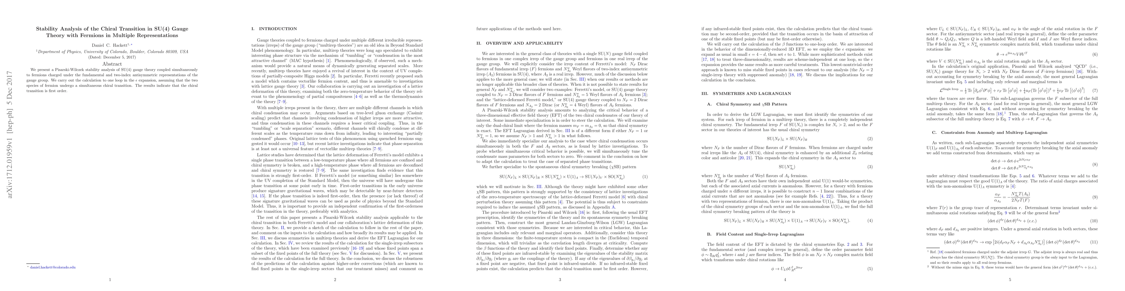The research paper analyzes stability of a chiral transition in SU(4) gauge theory with fermions in multiple representations, finding the transition to be first order and significant at one loop.