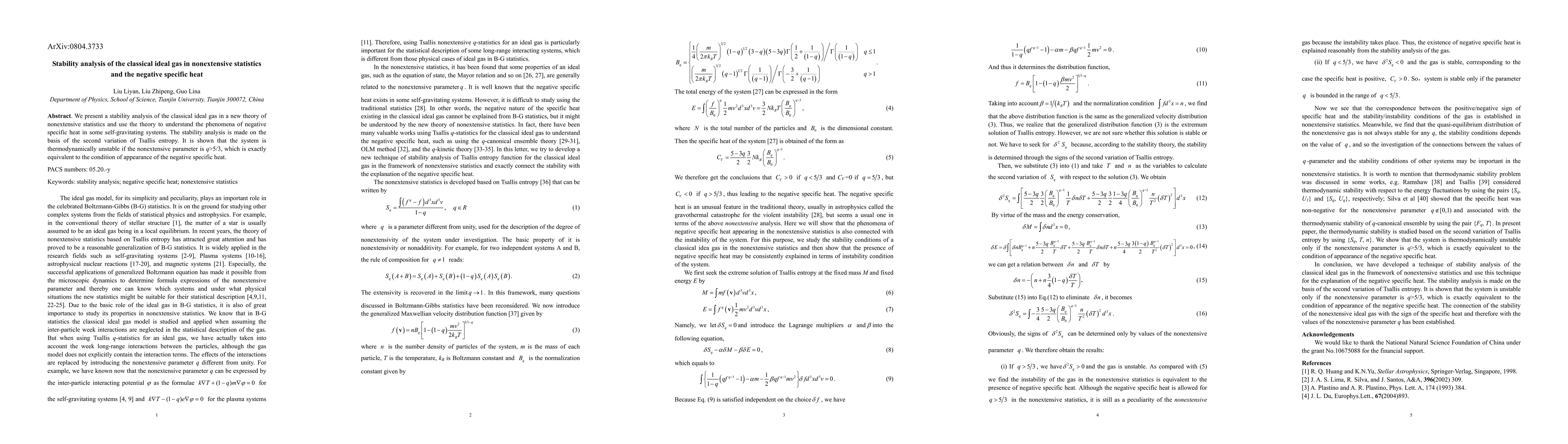 We present a stability analysis of the classical ideal gas in a new theory of nonextensive statistics and use the theory to understand the phenomena of negative specific heat in some self-gravitating systems. The stability analysis is made on the basis of the second variation of Tsallis entropy. It is shown that the system is thermodynamically unstable if the nonextensive parameter is q>5/3, which is exactly equivalent to the condition of appearance of the negative specific heat.