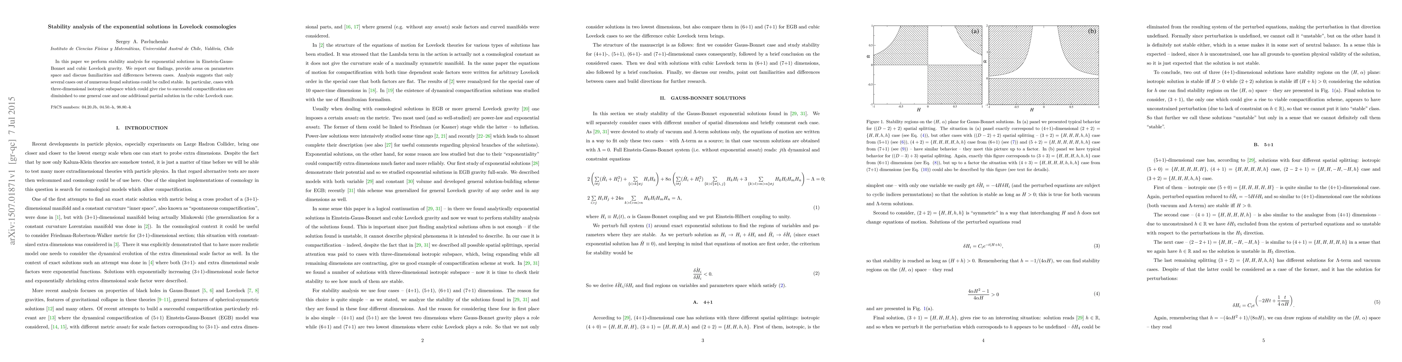 This paper conducts stability analysis of exponential solutions in Einstein-Gauss-Bonnet and cubic Lovelock gravity, finding that only a few solutions are stable. It identifies one general and one partial stable solution in the cubic Lovelock case, particularly for three-dimensional isotropic subspaces.