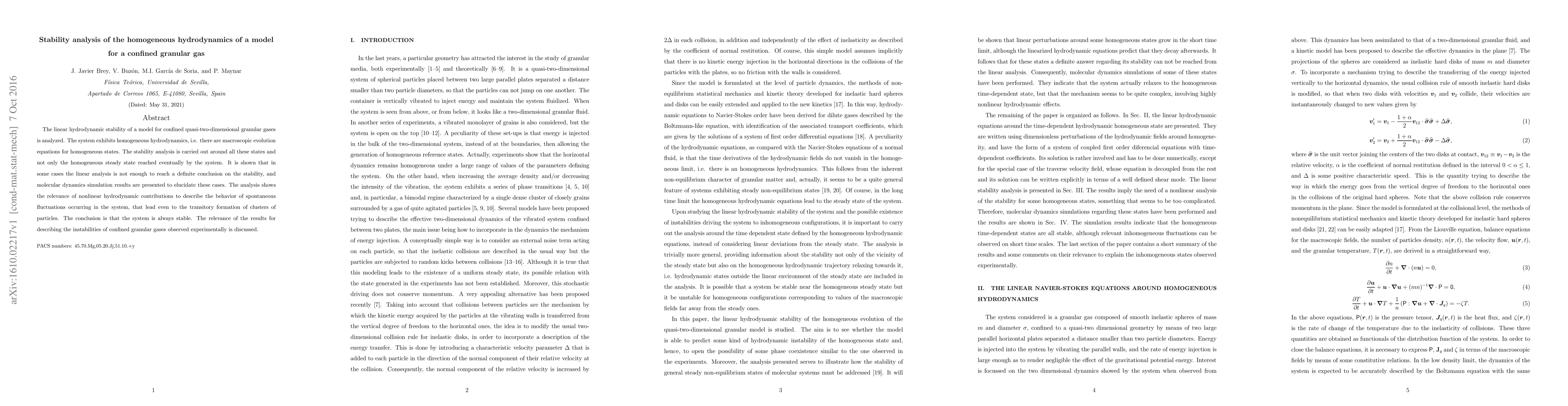 This paper analyzes the linear hydrodynamic stability of a quasi-two-dimensional granular gas model, revealing that linear analysis alone is insufficient in some cases. Molecular dynamics simulations complement the analysis, highlighting the importance of nonlinear contributions in describing spontaneous fluctuations and cluster formation, concluding the system's overall stability.