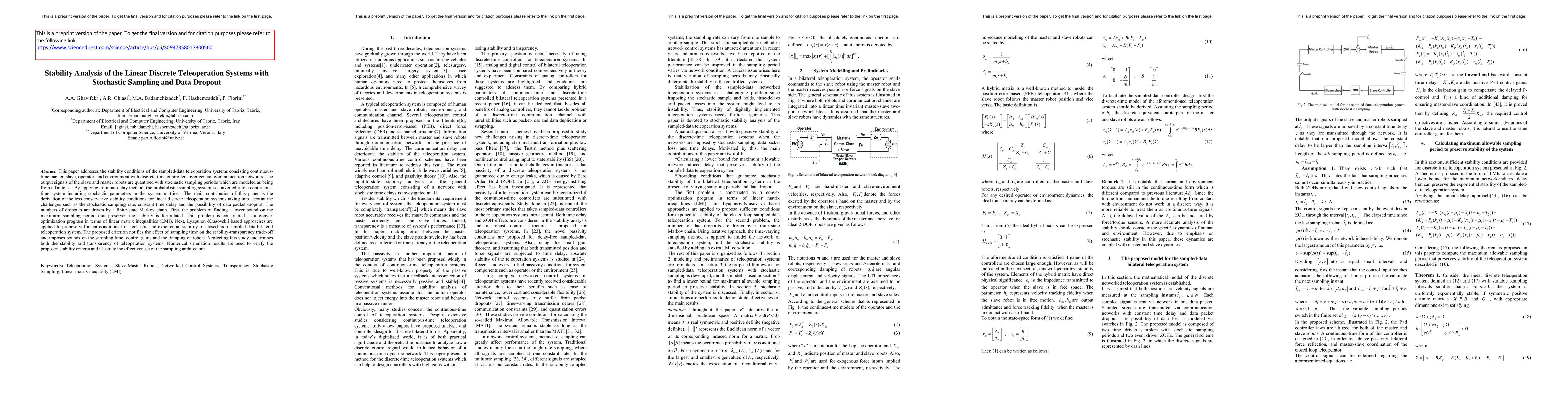 This paper derives less conservative stability conditions for linear discrete teleoperation systems with stochastic sampling and data dropout, using an input delay method and convex optimization. The study formulates a problem to find a lower bound on the maximum sampling period, proposing sufficient conditions for stability via Lyapunov Krasovskii approaches and validating the criteria through numerical simulations.
