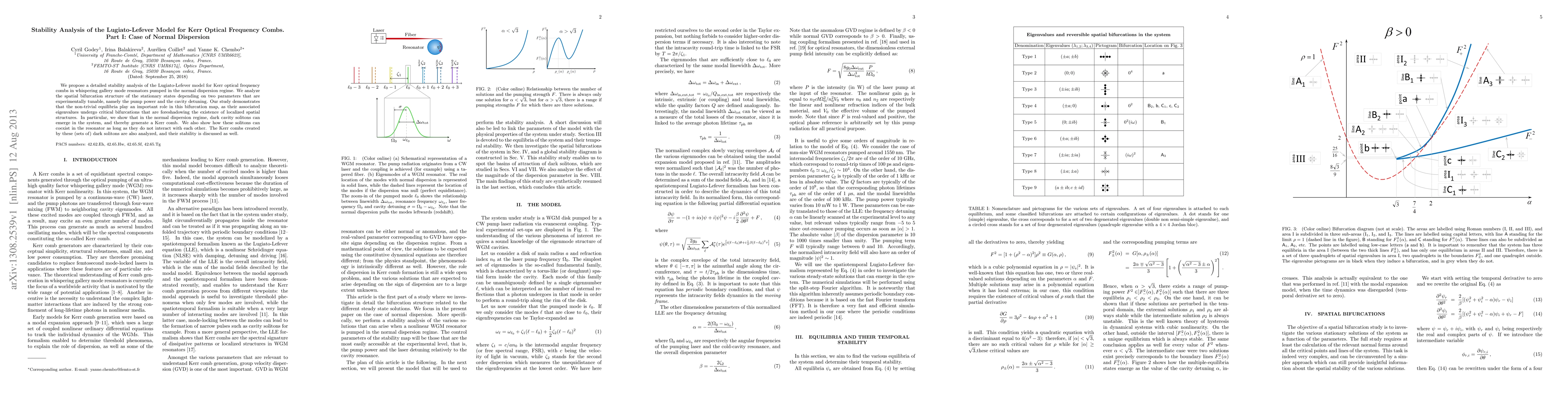This paper performs a stability analysis of the Lugiato-Lefever model for Kerr optical frequency combs under normal dispersion conditions. It reveals that dark cavity solitons can form and coexist, generating stable Kerr combs, and investigates their bifurcation behavior based on tunable parameters like pump power and cavity detuning.