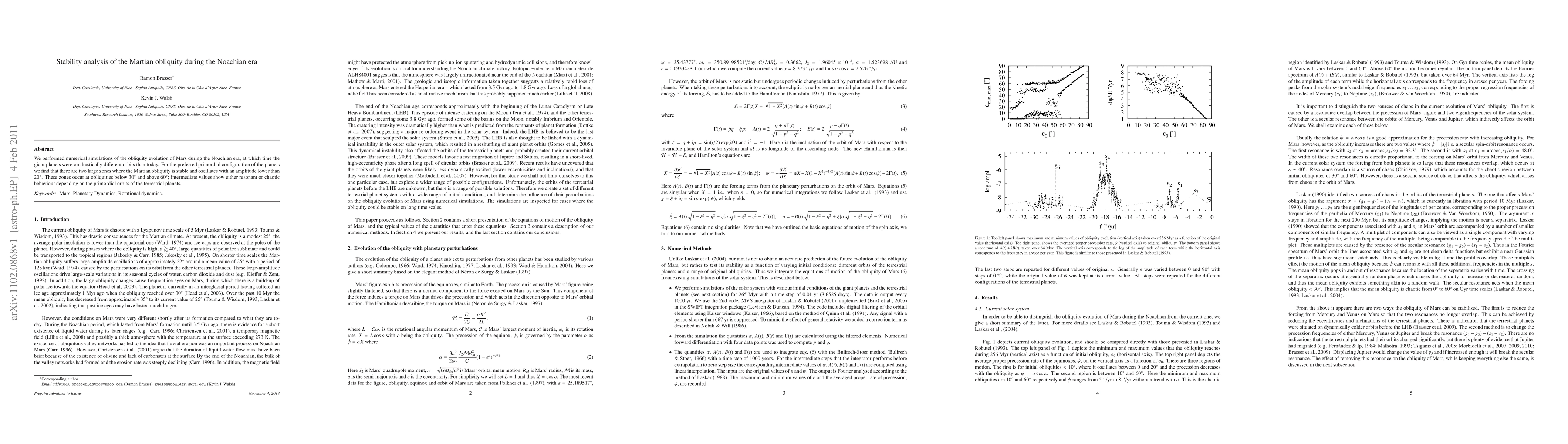 We performed numerical simulations of the obliquity evolution of Mars during the Noachian era, at which time the giant planets were on drastically different orbits than today. For the preferred primordial configuration of the planets we find that there are two large zones where the Martian obliquity is stable and oscillates with an amplitude lower than 20$^\circ$. These zones occur at obliquities below 30$^\circ$ and above 60$^\circ$; intermediate values show either resonant or chaotic behaviour depending on the primordial orbits of the terrestrial planets.