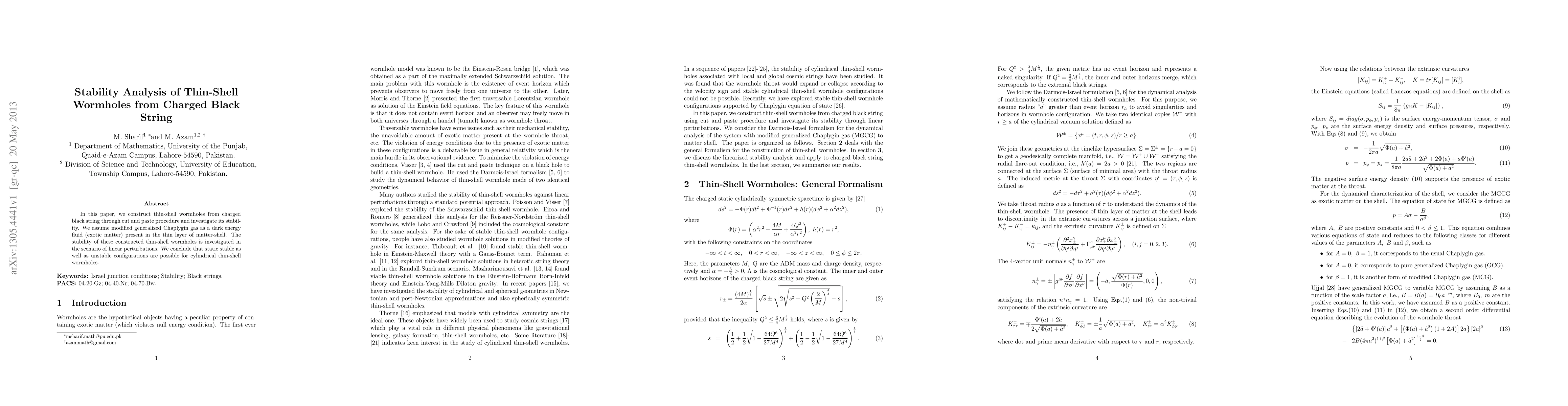 This research constructs thin-shell wormholes from charged black strings using a cut and paste procedure and analyzes their stability via linear perturbations. The study finds both static stable and unstable configurations for cylindrical thin-shell wormholes, assuming a modified generalized Chaplygin gas as the exotic matter in the thin layer.