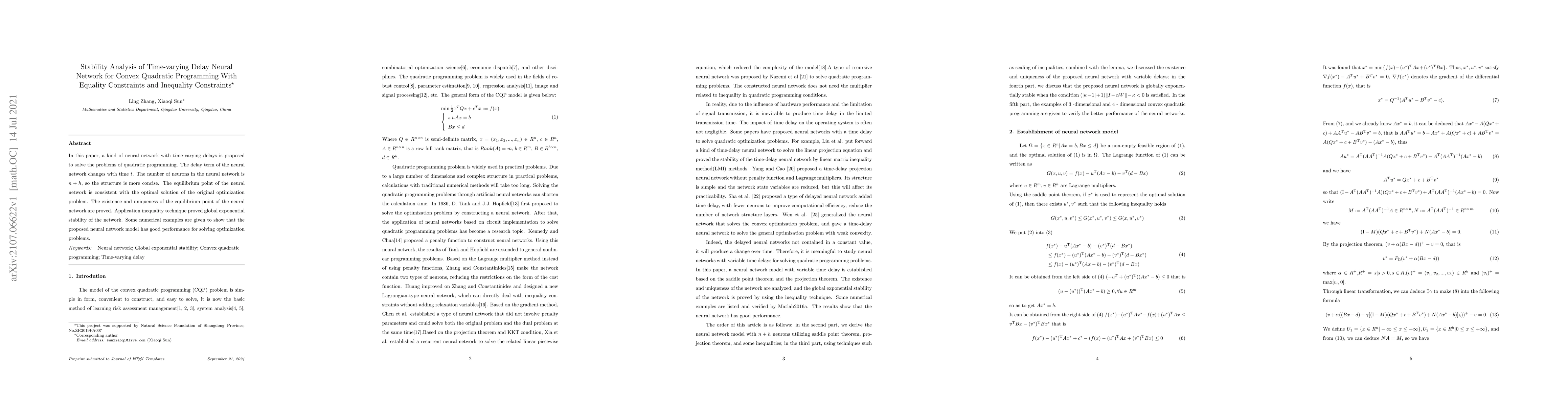 In this paper, a kind of neural network with time-varying delays is proposed to solve the problems of quadratic programming. The delay term of the neural network changes with time t. The number of neurons in the neural network is n + h, so the structure is more concise. The equilibrium point of the neural network is consistent with the optimal solution of the original optimization problem. The existence and uniqueness of the equilibrium point of the neural network are proved. Application inequality technique proved global exponential stability of the network. Some numerical examples are given to show that the proposed neural network model has good performance for solving optimization problems.