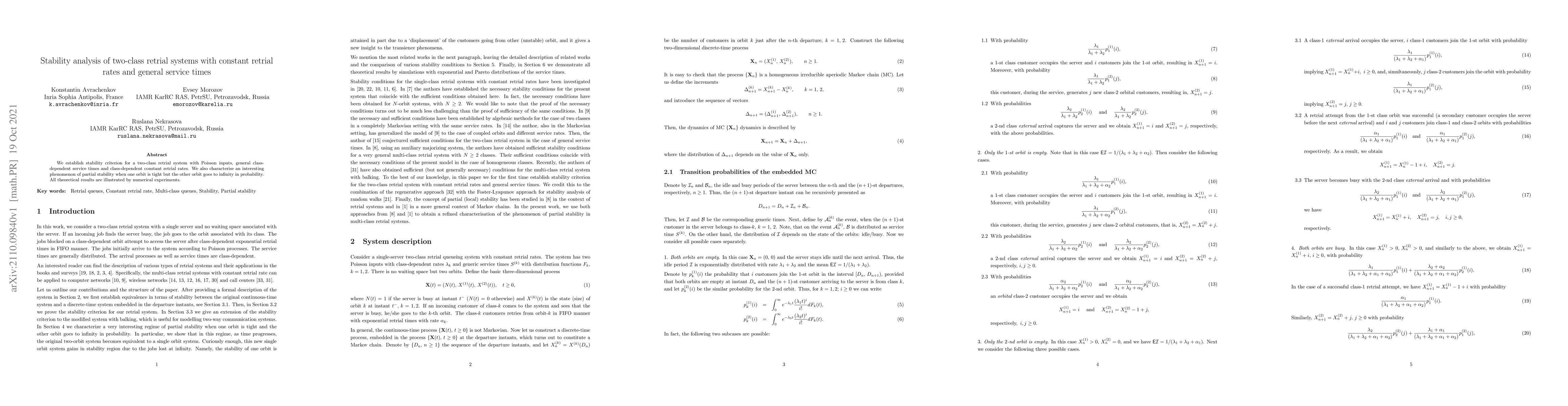 This paper establishes a stability criterion for a two-class retrial system with Poisson inputs, general service times, and constant retrial rates, and identifies a phenomenon of partial stability. Numerical experiments validate the theoretical findings.