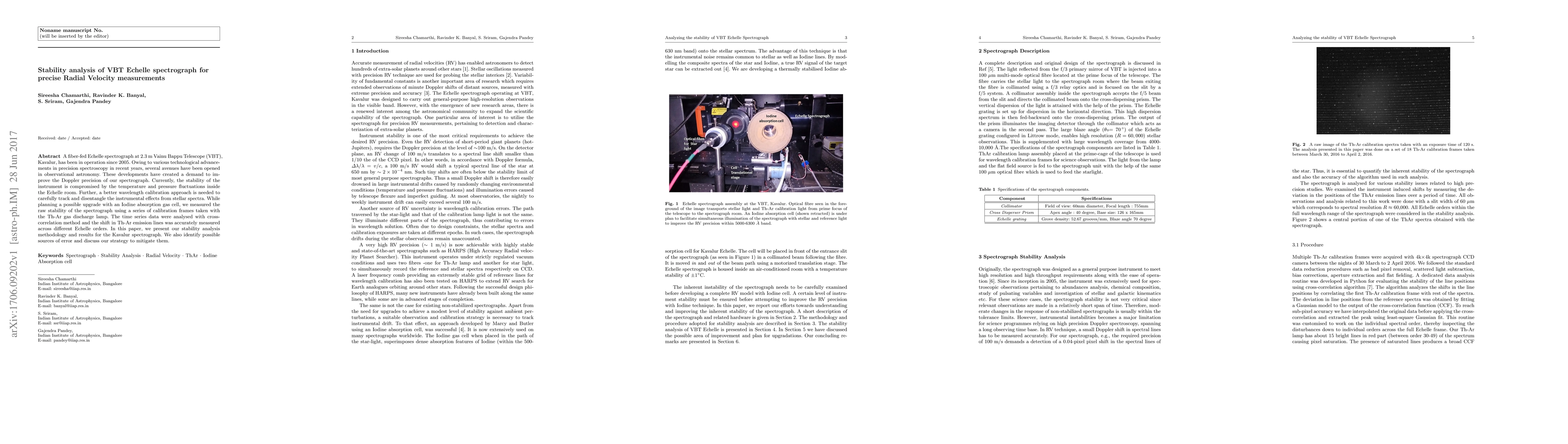 This paper analyzes the stability of the fiber-fed Echelle spectrograph at the Vainu Bappu Telescope, identifying temperature and pressure fluctuations as key sources of instability. The authors propose an Iodine absorption gas cell upgrade and present a methodology for measuring stability using ThAr calibration frames, aiming to improve radial velocity measurement precision.