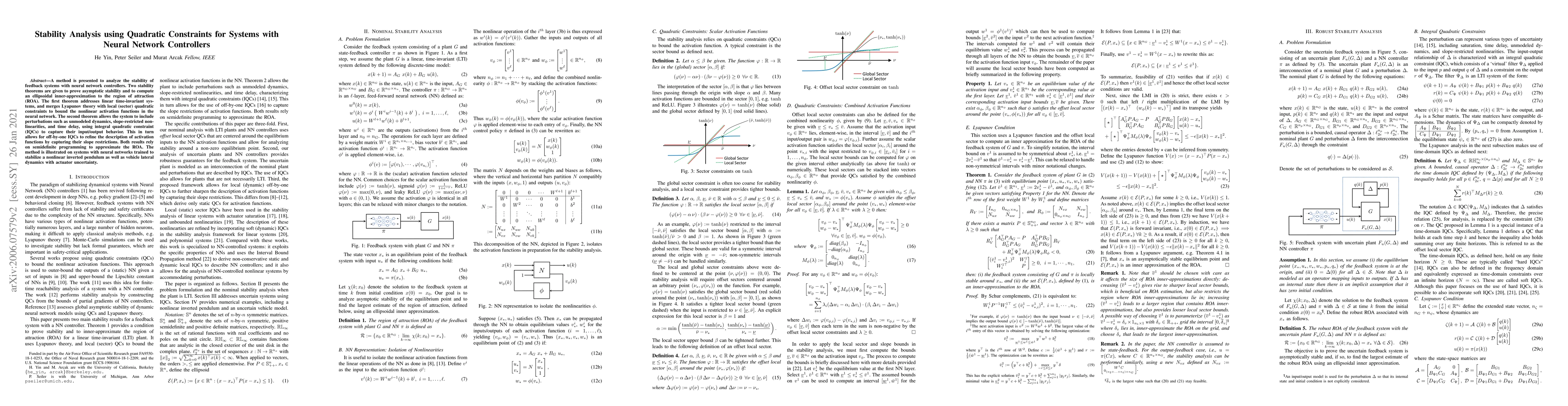 This paper presents a method for stability analysis of feedback systems with neural network controllers using quadratic constraints. It employs Lyapunov theory and integral quadratic constraints to prove asymptotic stability and compute an ellipsoidal inner-approximation of the region of attraction, illustrated through applications to a nonlinear inverted pendulum and vehicle lateral dynamics.