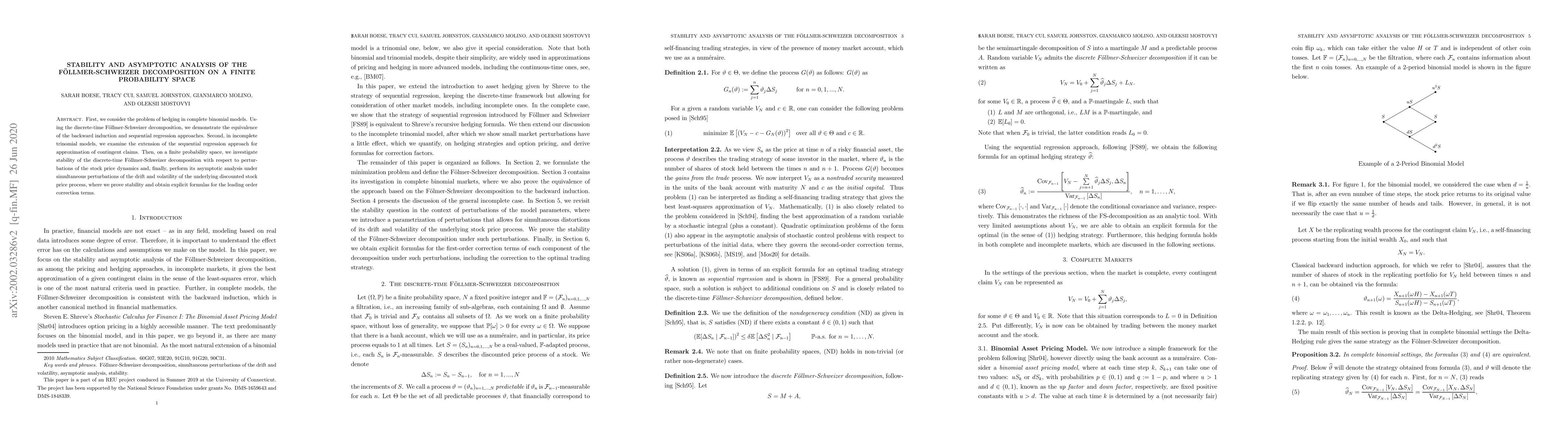 This paper explores the stability and asymptotic behavior of the F\"ollmer-Schweizer decomposition in complete and incomplete financial models, demonstrating equivalence between backward induction and sequential regression approaches, and providing stability and correction term formulas for perturbations in stock price dynamics.