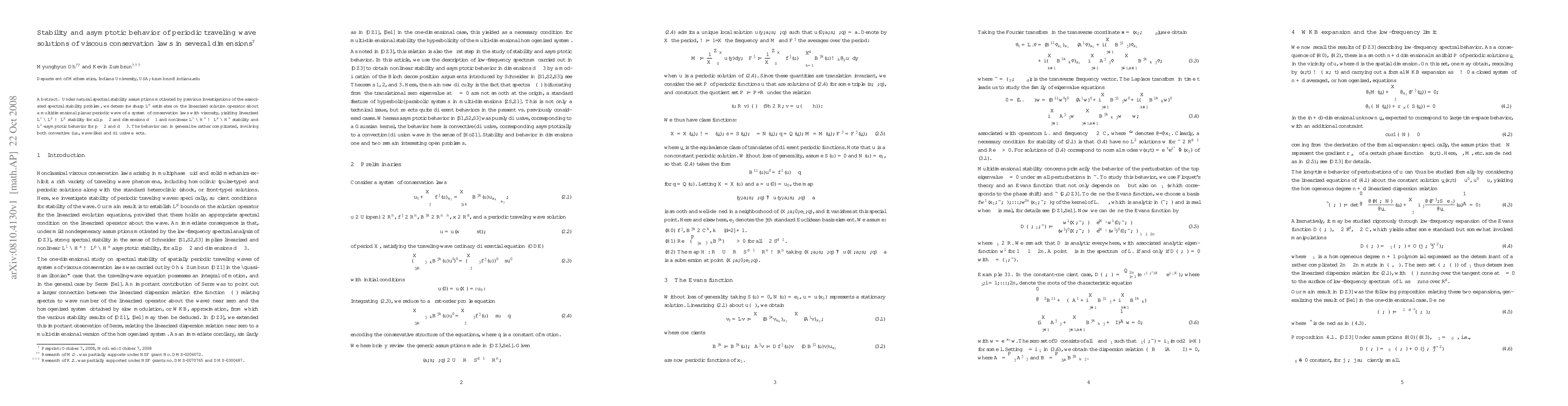 This paper investigates the stability and asymptotic behavior of periodic traveling waves in viscous conservation laws across multiple dimensions. It establishes sharp $L^p$ estimates for the linearized operator around these waves, leading to stability results for various function spaces and dimensions.