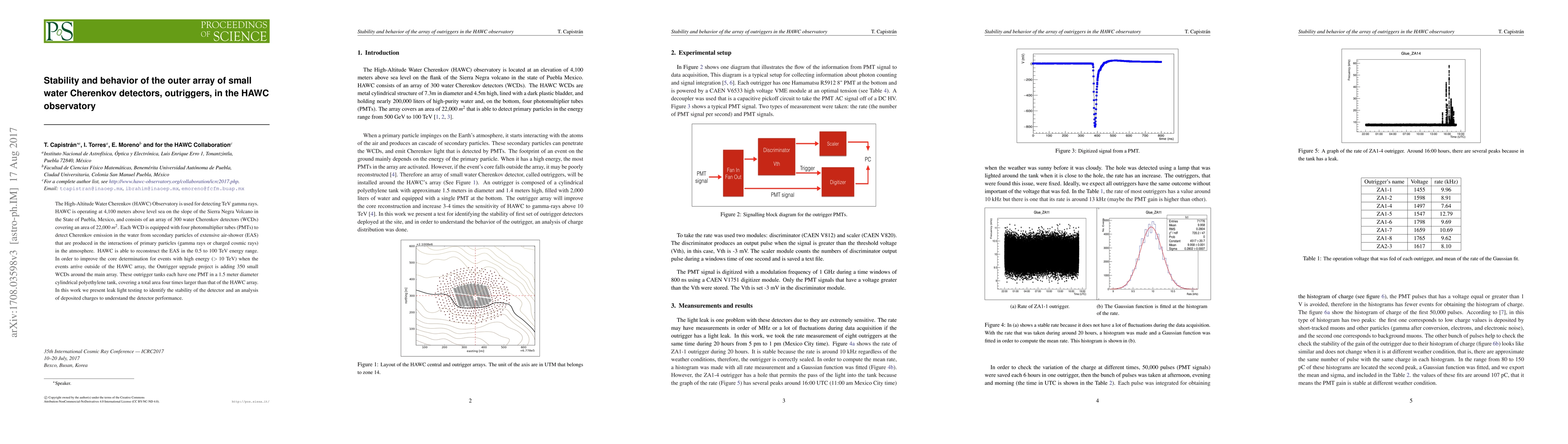 The High-Altitude Water Cherenkov (HAWC) Observatory is used for detecting TeV gamma rays. HAWC is operating at 4,100 meters above level sea on the slope of the Sierra Negra Volcano in the State of Puebla, Mexico, and consists of an array of 300 water Cherenkov detectors (WCDs) covering an area of 22,000 $m^2$. Each WCD is equipped with four photomultiplier tubes (PMTs) to detect Cherenkov emission in the water from secondary particles of extensive air-shower (EAS) that are produced in the interactions of primary particles (gamma rays or charged cosmic rays) in the atmosphere. HAWC is able to reconstruct the EAS in the 0.5 to 100 TeV energy range. In order to improve the core determination for events with high energy ($>10$ TeV) when the events arrive outside of the HAWC array, the Outrigger upgrade project is adding 350 small WCDs around the main array. These outrigger tanks each have one PMT in a 1.5 meter diameter cylindrical polyethylene tank, covering a total area four times larger than that of the HAWC array. In this work we present leak light testing to identify the stability of the detector and an analysis of deposited charges to understand the detector performance.