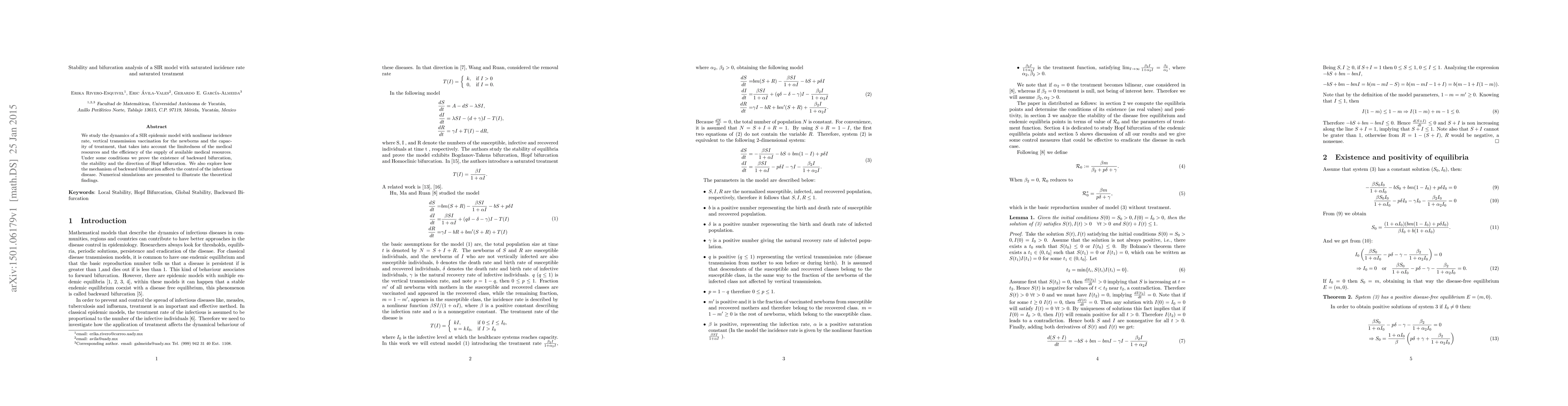 This paper investigates the dynamics of a SIR epidemic model with a nonlinear incidence rate, vertical transmission, and treatment capacity, revealing the existence of backward bifurcation and Hopf bifurcation under certain conditions. Numerical simulations demonstrate the impact of backward bifurcation on disease control.