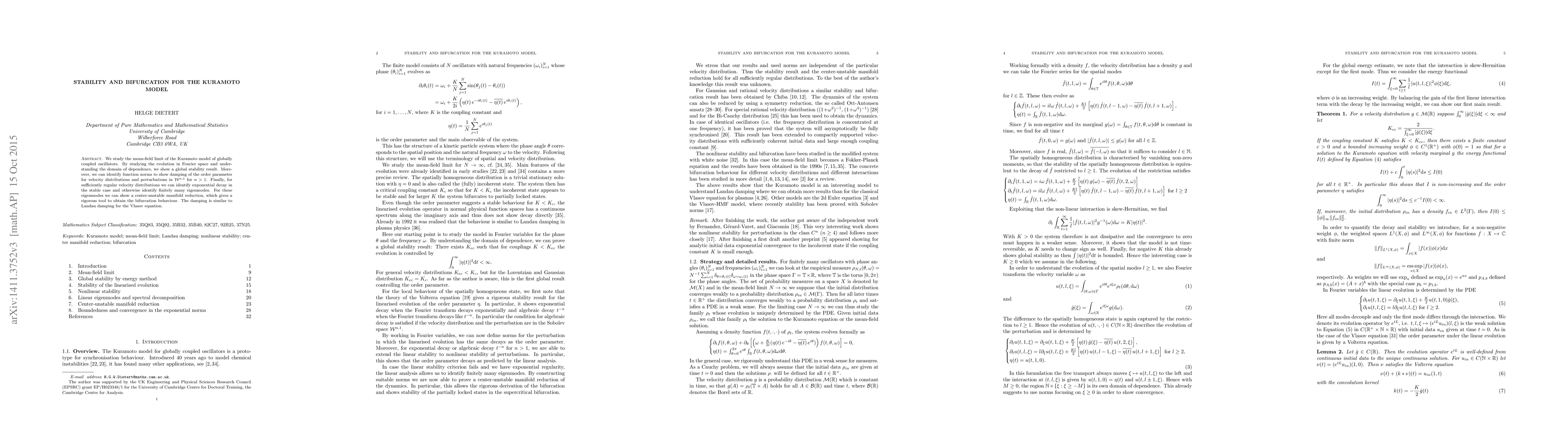 This paper explores the stability and bifurcation in the Kuramoto model of globally coupled oscillators, demonstrating global stability and identifying damping of the order parameter. It also reveals exponential decay for stable cases and finitely many eigenmodes, providing a rigorous method for understanding bifurcation behavior.