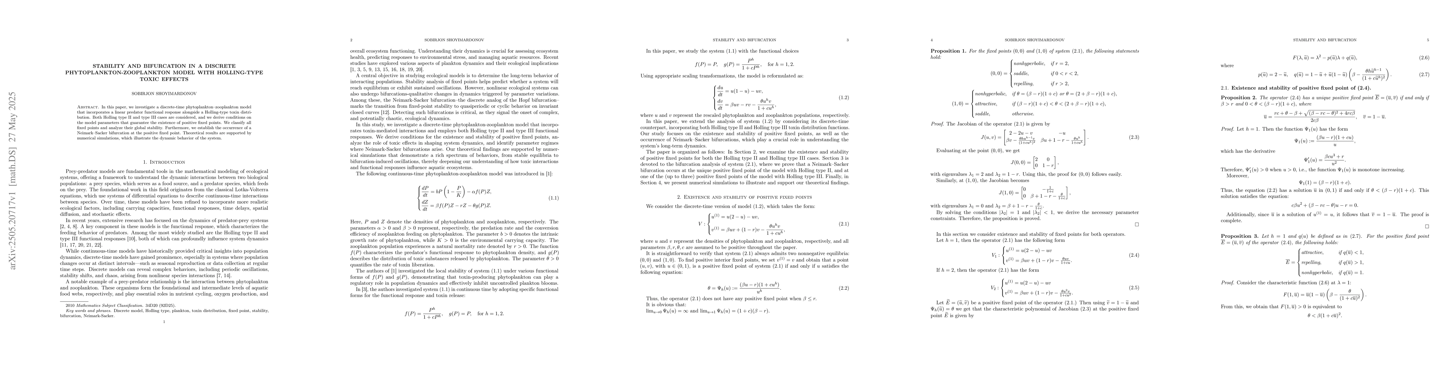 Derivation of conditions ensuring positive fixed points and analysis of global stability in a discrete phytoplankton-zooplankton model with Holling-type toxic effects, along with bifurcation analysis.