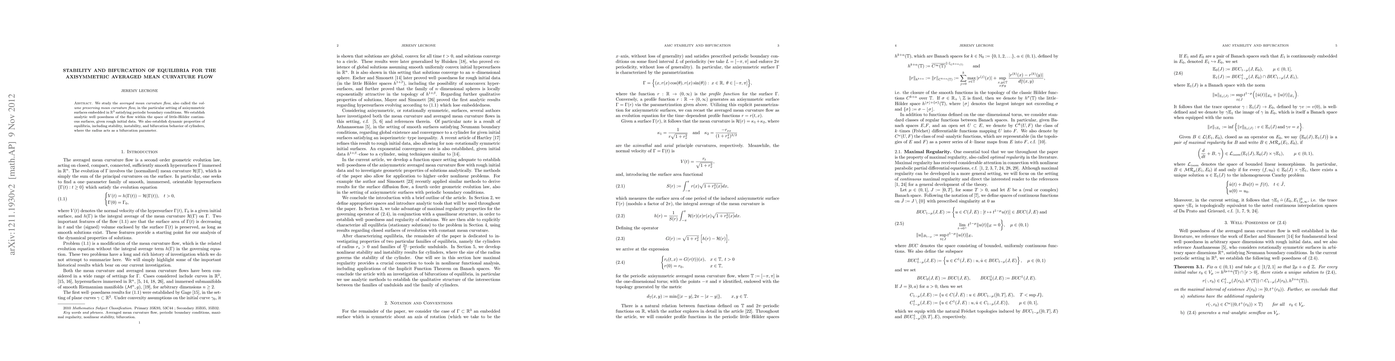 We study the averaged mean curvature flow, also called the volume preserving mean curvature flow, in the particular setting of axisymmetric surfaces embedded in R^3 satisfying periodic boundary conditions. We establish analytic well--posedness of the flow within the space of little-H\"older continuous surfaces, given rough initial data. We also establish dynamic properties of equilibria, including stability, instability, and bifurcation behavior of cylinders, where the radius acts as a bifurcation parameter.