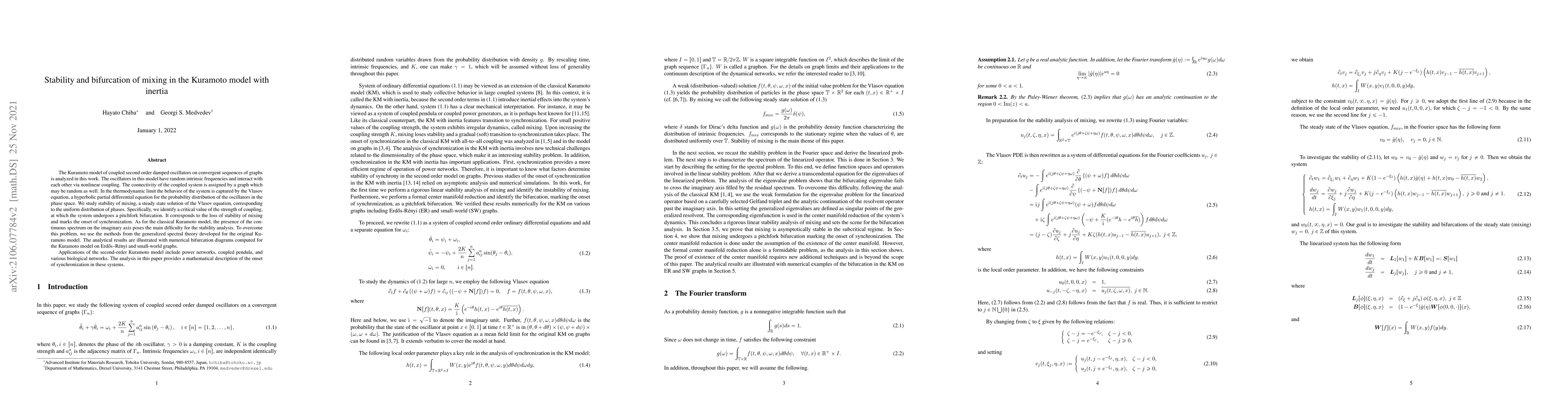 This paper analyzes the stability and bifurcation of mixing in the Kuramoto model with inertia, focusing on coupled second-order oscillators on graphs. The study identifies a critical coupling strength leading to a pitchfork bifurcation, marking the transition from mixing to synchronization, using generalized spectral theory and supported by numerical simulations.
