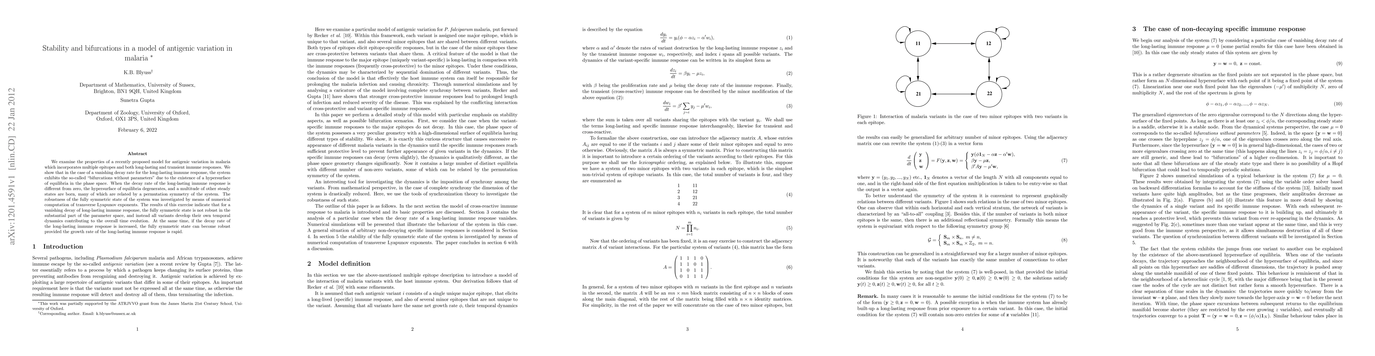 We examine the properties of a recently proposed model for antigenic variation in malaria which incorporates multiple epitopes and both long-lasting and transient immune responses. We show that in the case of a vanishing decay rate for the long-lasting immune response, the system exhibits the so-called "bifurcations without parameters" due to the existence of a hypersurface of equilibria in the phase space. When the decay rate of the long-lasting immune response is different from zero, the hypersurface of equilibria degenerates, and a multitude of other steady states are born, many of which are related by a permutation symmetry of the system. The robustness of the fully symmetric state of the system was investigated by means of numerical computation of transverse Lyapunov exponents. The results of this exercise indicate that for a vanishing decay of long-lasting immune response, the fully symmetric state is not robust in the substantial part of the parameter space, and instead all variants develop their own temporal dynamics contributing to the overall time evolution. At the same time, if the decay rate of the long-lasting immune response is increased, the fully symmetric state can become robust provided the growth rate of the long-lasting immune response is rapid.