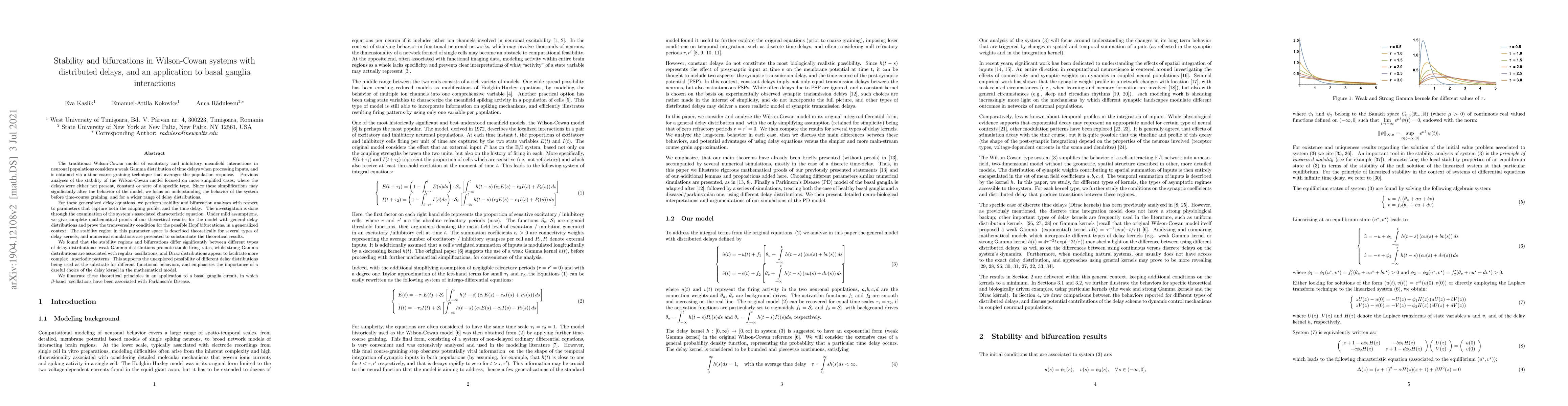 Researchers studied the Wilson-Cowan model of neuronal interactions with distributed delays to understand its stability and bifurcations, with implications for Parkinson's Disease treatment, particularly in basal ganglia circuits.