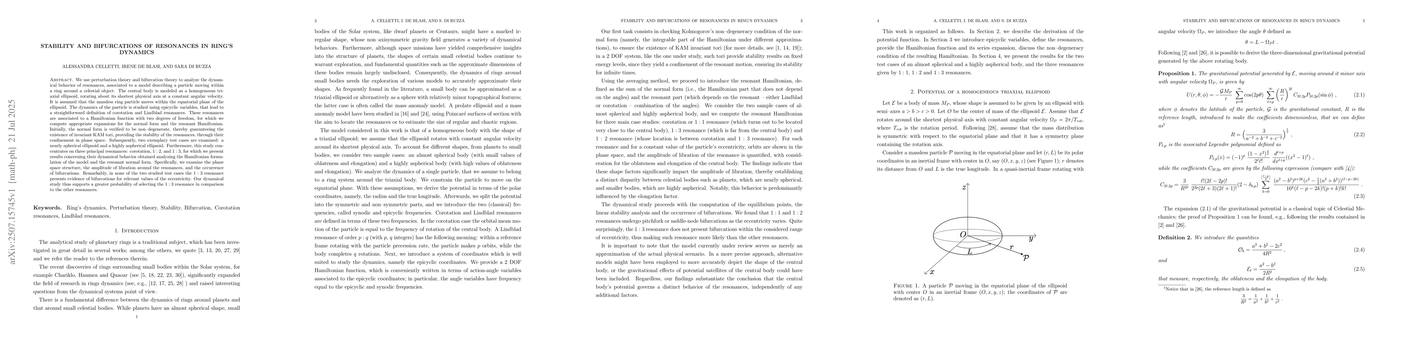 The study employs perturbation theory and bifurcation theory to analyze the dynamical behavior of resonances in a model describing a particle moving within a ring around a celestial object modeled as a homogeneous triaxial ellipsoid.