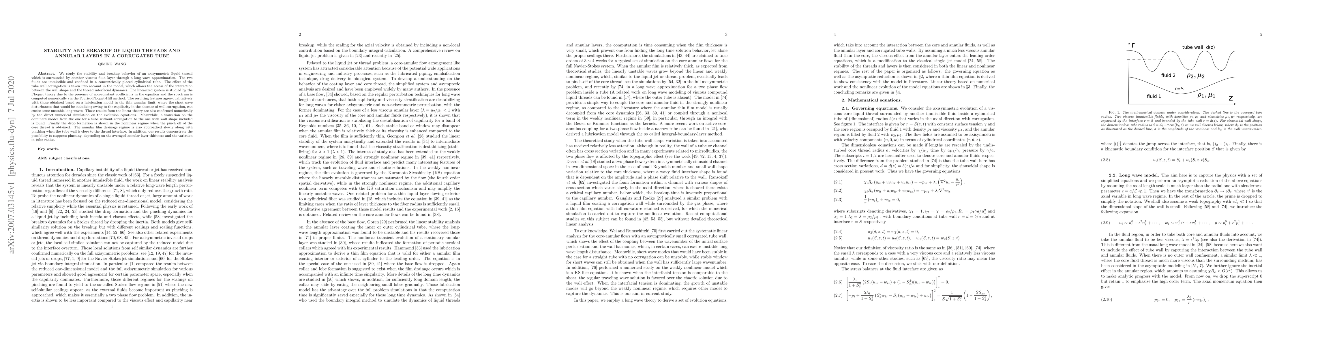 We study the stability and breakup behavior of an axisymmetric liquid thread which is surrounded by another viscous fluid layer through a long wave approximation. The two fluids are immiscible and confined in a concentrically placed cylindrical tube. The effect of the tube wall corrugation is taken into account in the model, which allows the access of the interaction between the wall shape and the thread interfacial dynamics. The linearized system is studied by the Floquet theory due to the presence of non-constant coefficients in the equation and the spectrum is computed numerically via the Fourier-Floquet-Hill method. The resulting features agree qualitatively with those obtained based on a lubrication model in the thin annulus limit, where the short-wave disturbances that would be stabilizing owing to the capillarity in the absence of wall corrugation, can excite some unstable long waves. Those results from the linear theory are also confirmed numerically by the direct numerical simulation on the evolution equations. Meanwhile, a transition on the dominant modes from the one for a tube without corrugation to the one with wall shape included is found. Finally the drop formation is shown in the nonlinear regime when the pinch off of the core thread is obtained. The annular film drainage regime is also approached slowly along with pinching when the tube wall is close to the thread interface. In addition, our results demonstrate the possibility to suppress pinching, depending on the averaged annular layer thickness and the variation in tube radius.