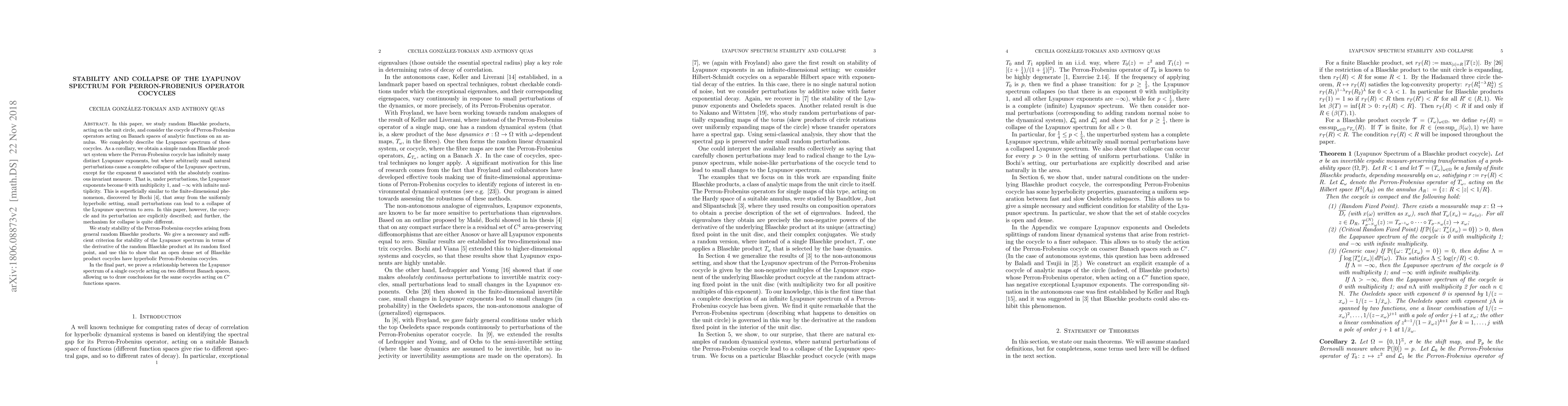 This paper investigates the Lyapunov spectrum of Perron-Frobenius operator cocycles arising from random Blaschke products, demonstrating that small perturbations can collapse the spectrum to zero except for the exponent 0. It provides a criterion for stability based on the derivative at the fixed point and concludes with a relationship between the Lyapunov spectrum in different Banach spaces.