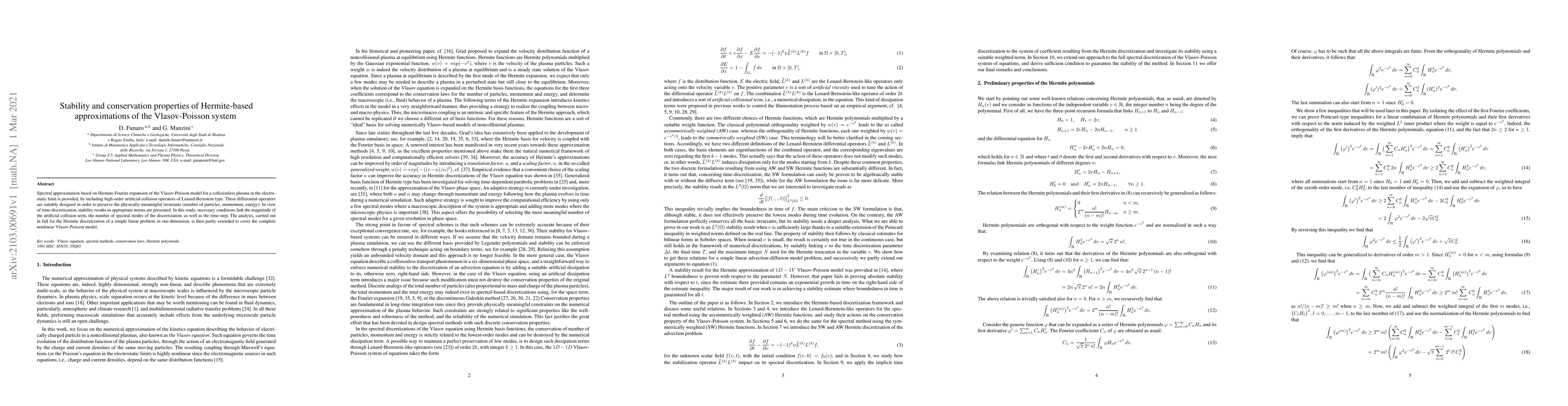 Spectral approximation based on Hermite-Fourier expansion of the Vlasov-Poisson model for a collisionless plasma in the electro-static limit is provided, by including high-order artificial collision operators of Lenard-Bernstein type. These differential operators are suitably designed in order to preserve the physically-meaningful invariants (number of particles, momentum, energy). In view of time-discretization, stability results in appropriate norms are presented. In this study, necessary conditions link the magnitude of the artificial collision term, the number of spectral modes of the discretization, as well as the time-step. The analysis, carried out in full for the Hermite discretization of a simple linear problem in one-dimension, is then partly extended to cover the complete nonlinear Vlasov-Poisson model.