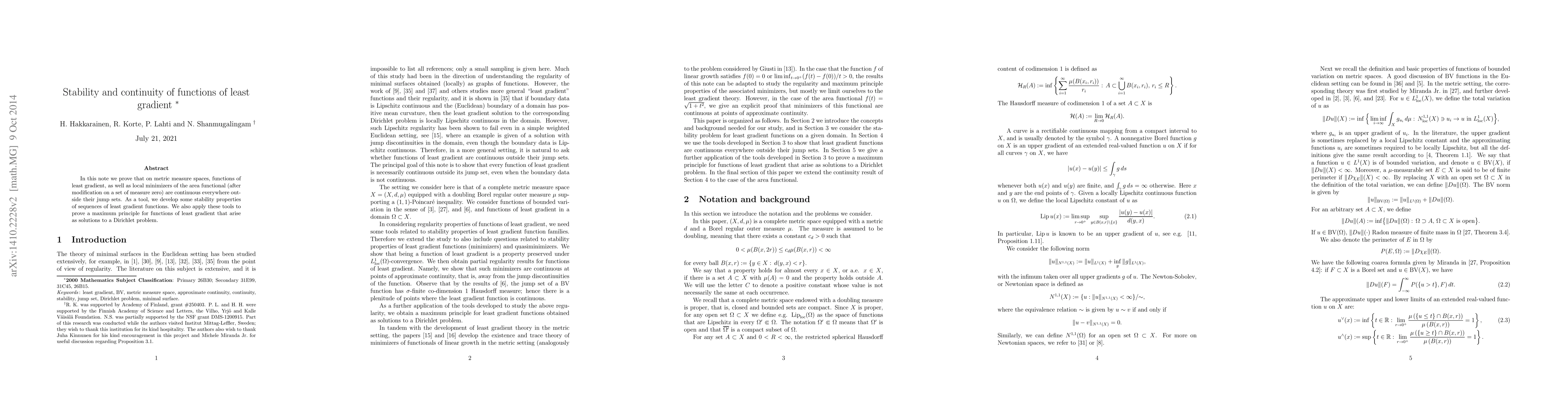 This paper proves the continuity of functions of least gradient outside their jump sets on metric measure spaces and develops stability properties for sequences of such functions. It also establishes a maximum principle for these functions arising from Dirichlet problems.