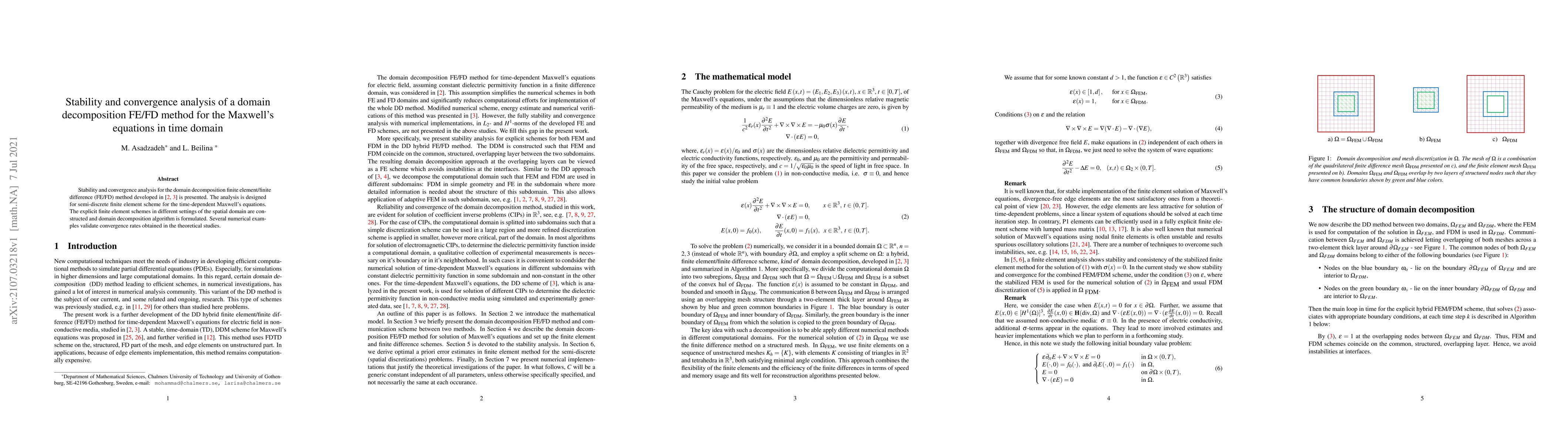 This paper presents stability and convergence analysis for a domain decomposition finite element/finite difference method applied to the time-dependent Maxwell's equations. Numerical examples validate the theoretical convergence rates derived from the analysis.