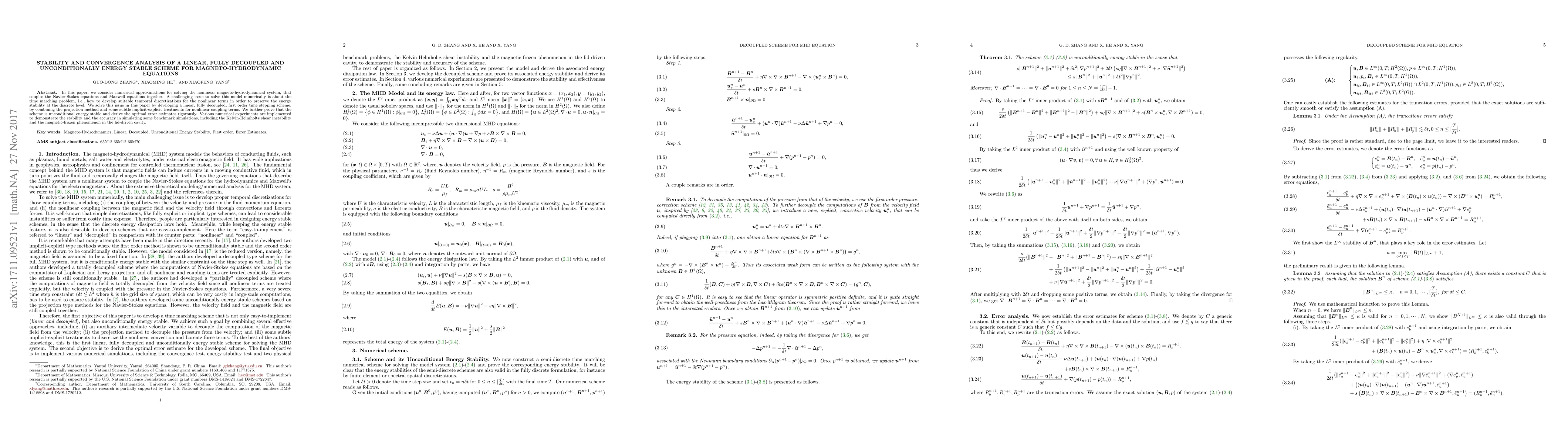In this paper, we consider numerical approximations for solving the nonlinear magneto-hydrodynamical system, that couples the Navier-Stokes equations and Maxwell equations together. A challenging issue to solve this model numerically is about the time marching problem, i.e., how to develop suitable temporal discretizations for the nonlinear terms in order to preserve the energy stability at the discrete level. We solve this issue in this paper by developing a linear, fully decoupled, first order time-stepping scheme, by combining the projection method and some subtle implicit-explicit treatments for nonlinear coupling terms. We further prove that the scheme is unconditional energy stable and derive the optimal error estimates rigorously. Various numerical experiments are implemented to demonstrate the stability and the accuracy in simulating some benchmark simulations, including the Kelvin-Helmholtz shear instability and the magnetic-frozen phenomenon in the lid-driven cavity.