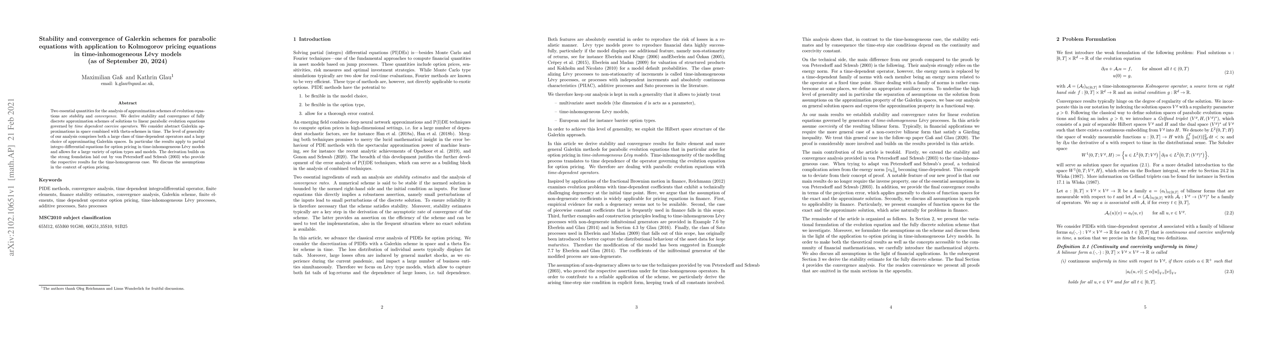 This paper derives stability and convergence for fully discrete Galerkin schemes applied to linear parabolic evolution equations with time-dependent operators. The results extend to a wide range of time-inhomogeneous Lévy models for option pricing, generalizing previous findings for time-homogeneous cases.