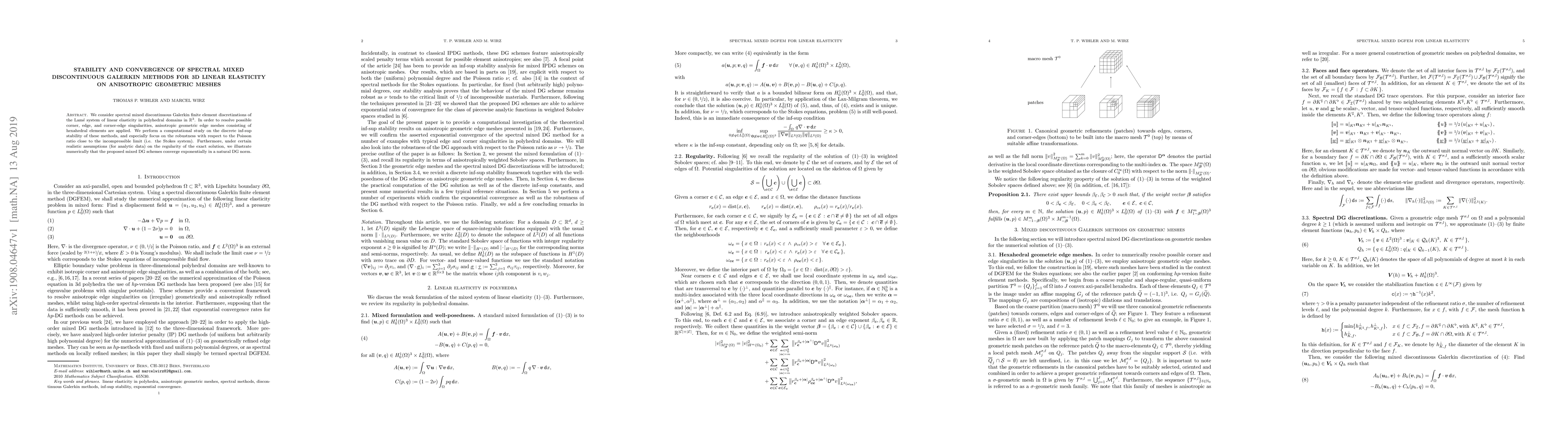 We consider spectral mixed discontinuous Galerkin finite element discretizations of the Lam\'e system of linear elasticity in polyhedral domains in $\mathbb{R}^3$. In order to resolve possible corner, edge, and corner-edge singularities, anisotropic geometric edge meshes consisting of hexahedral elements are applied. We perform a computational study on the discrete inf-sup stability of these methods, and especially focus on the robustness with respect to the Poisson ratio close to the incompressible limit (i.e. the Stokes system). Furthermore, under certain realistic assumptions (for analytic data) on the regularity of the exact solution, we illustrate numerically that the proposed mixed DG schemes converge exponentially in a natural DG norm.