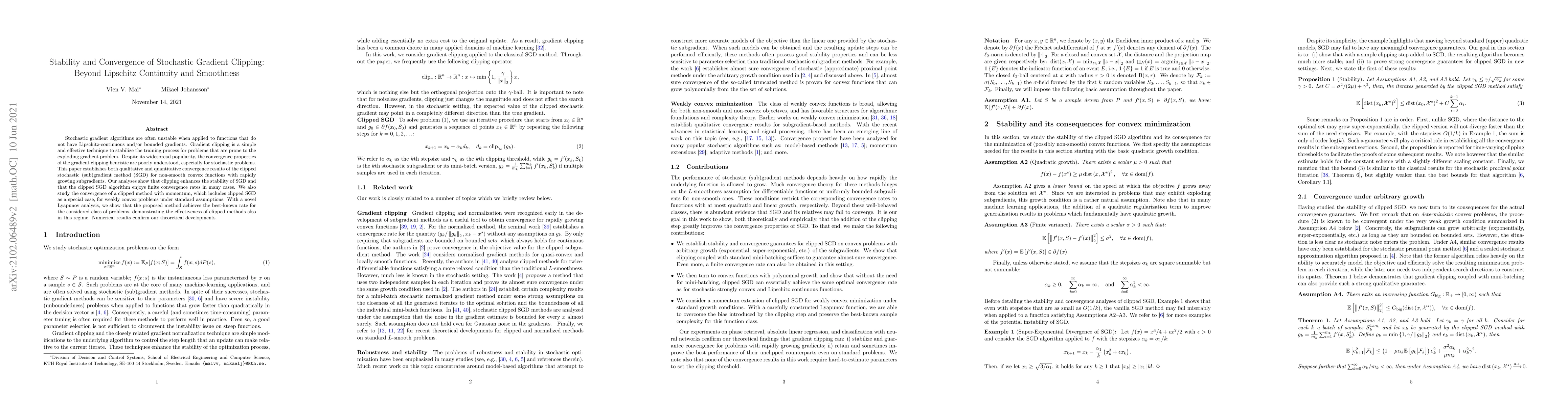 This paper explores the stability and convergence of stochastic gradient clipping for non-smooth convex functions, establishing both qualitative and quantitative convergence results for clipped stochastic gradient descent (SGD). The analysis shows that gradient clipping enhances stability and achieves finite convergence rates, even for weakly convex problems, outperforming standard methods.