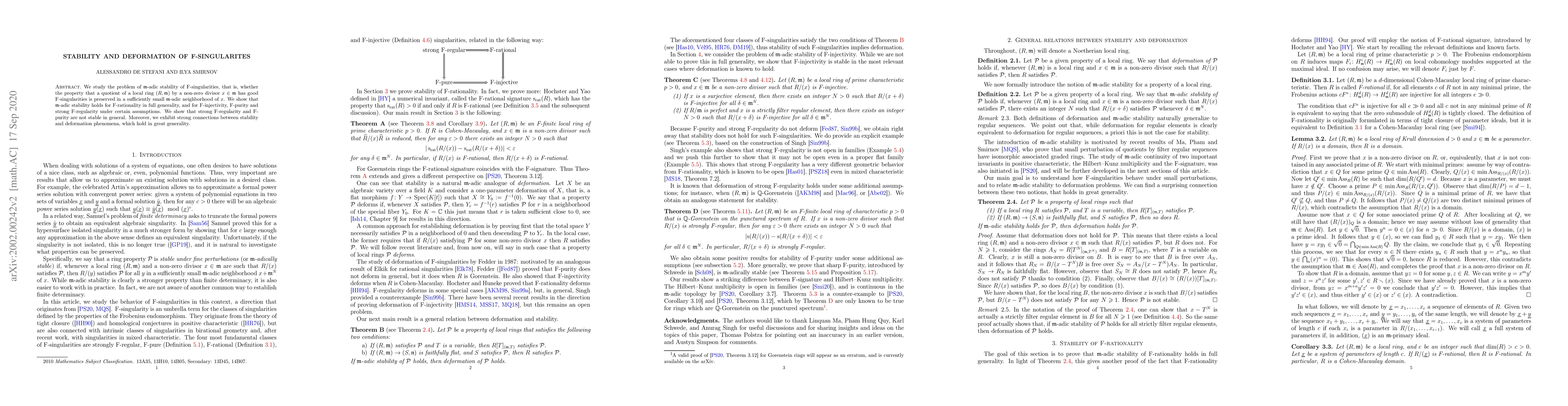 The paper investigates the $\mathfrak{m}$-adic stability of F-singularities, demonstrating that F-rationality remains stable, while F-injectivity, F-purity, and strong F-regularity exhibit stability under specific conditions. It also highlights the lack of stability for strong F-regularity and F-purity in general and draws strong links between stability and deformation phenomena.