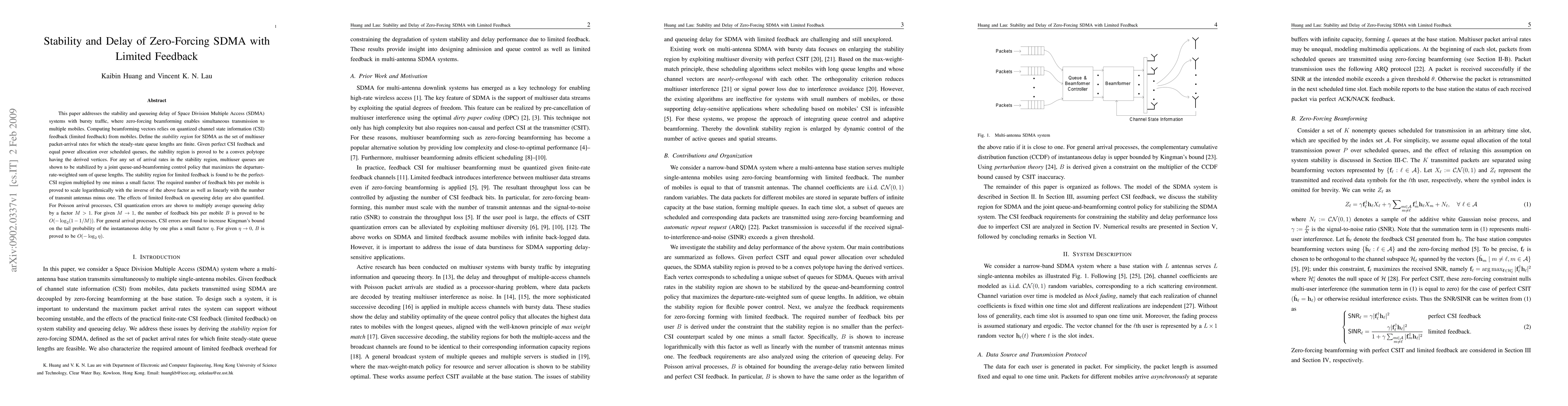 This paper investigates the stability and delay in SDMA systems using zero-forcing beamforming with limited feedback, proving that stability regions shrink with reduced feedback. The number of feedback bits required scales logarithmically with the feedback quality and linearly with the number of antennas minus one, impacting queueing delay.