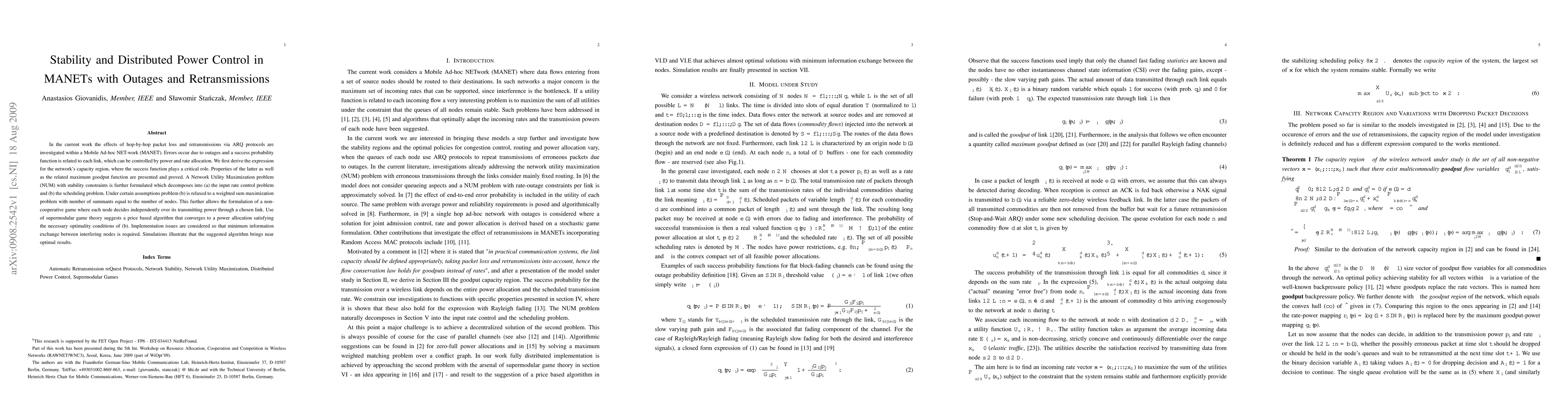 In the current work the effects of hop-by-hop packet loss and retransmissions via ARQ protocols are investigated within a Mobile Ad-hoc NET-work (MANET). Errors occur due to outages and a success probability function is related to each link, which can be controlled by power and rate allocation. We first derive the expression for the network's capacity region, where the success function plays a critical role. Properties of the latter as well as the related maximum goodput function are presented and proved. A Network Utility Maximization problem (NUM) with stability constraints is further formulated which decomposes into (a) the input rate control problem and (b) the scheduling problem. Under certain assumptions problem (b) is relaxed to a weighted sum maximization problem with number of summants equal to the number of nodes. This further allows the formulation of a non-cooperative game where each node decides independently over its transmitting power through a chosen link. Use of supermodular game theory suggests a price based algorithm that converges to a power allocation satisfying the necessary optimality conditions of (b). Implementation issues are considered so that minimum information exchange between interfering nodes is required. Simulations illustrate that the suggested algorithm brings near optimal results.