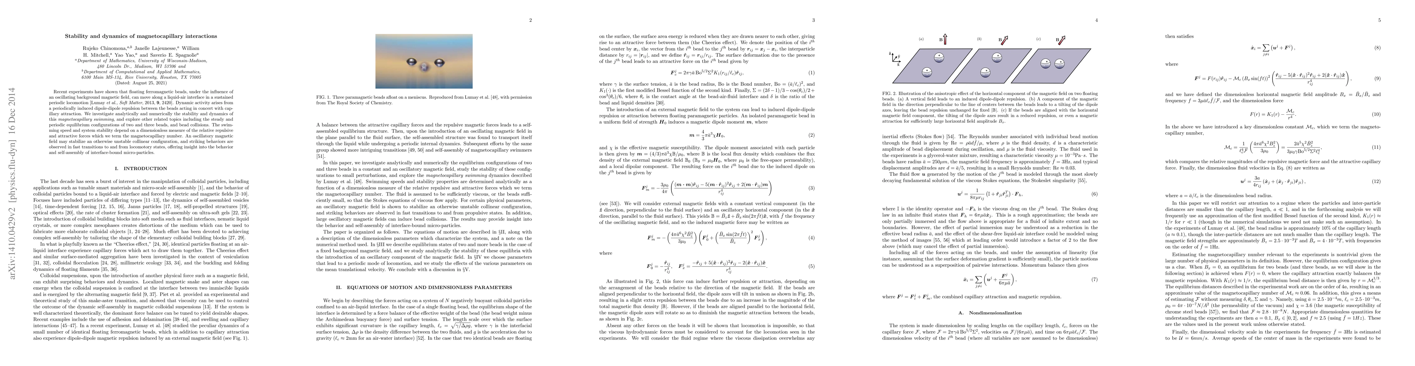 Recent experiments have shown that floating ferromagnetic beads, under the influence of an oscillating background magnetic field, can move along a liquid-air interface in a sustained periodic locomotion [Lumay et al., Soft Matter, 2013, 9, 2420]. Dynamic activity arises from a periodically induced dipole-dipole repulsion between the beads acting in concert with capillary attraction. We investigate analytically and numerically the stability and dynamics of this magnetocapillary swimming, and explore other related topics including the steady and periodic equilibrium configurations of two and three beads, and bead collisions. The swimming speed and system stability depend on a dimensionless measure of the relative repulsive and attractive forces which we term the magnetocapillary number. An oscillatory magnetic field may stabilize an otherwise unstable collinear configuration, and striking behaviors are observed in fast transitions to and from locomotory states, offering insight into the behavior and self-assembly of interface-bound micro-particles.