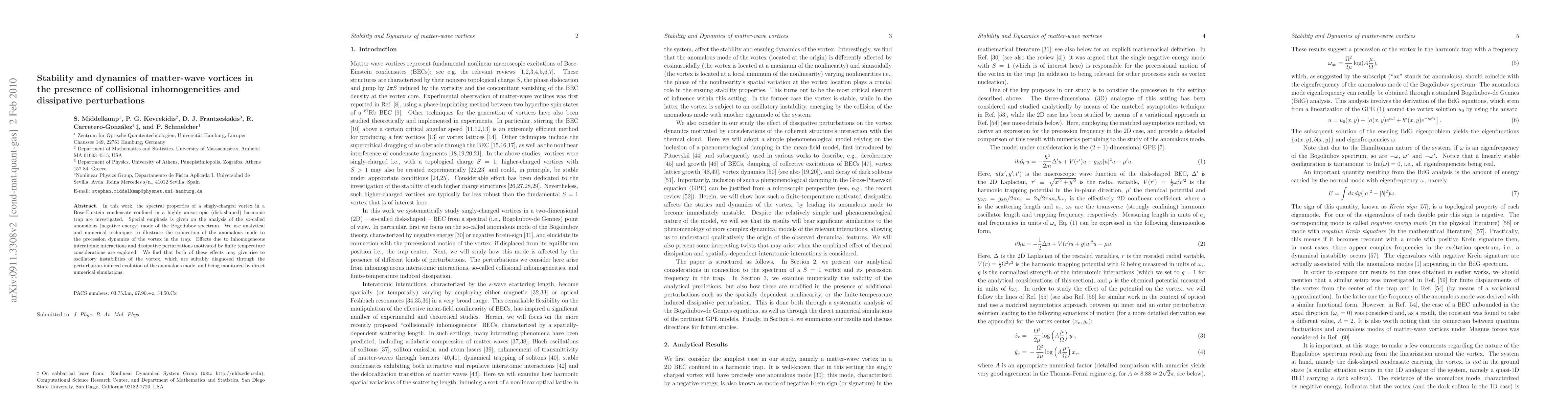 In this work, the spectral properties of a singly-charged vortex in a In this work, the spectral properties of a singly-charged vortex in a Bose-Einstein condensate confined in a highly anisotropic (disk-shaped) harmonic trap are investigated. Special emphasis is given on the analysis of the so-called anomalous (negative energy) mode of the Bogoliubov spectrum. We use analytical and numerical techniques to illustrate the connection of the anomalous mode to the precession dynamics of the vortex in the trap. Effects due to inhomogeneous interatomic interactions and dissipative perturbations motivated by finite temperature considerations are explored. We find that both of these effects may give rise to oscillatory instabilities of the vortex, which are suitably diagnosed through the perturbation-induced evolution of the anomalous mode, and being monitored by direct numerical simulations.