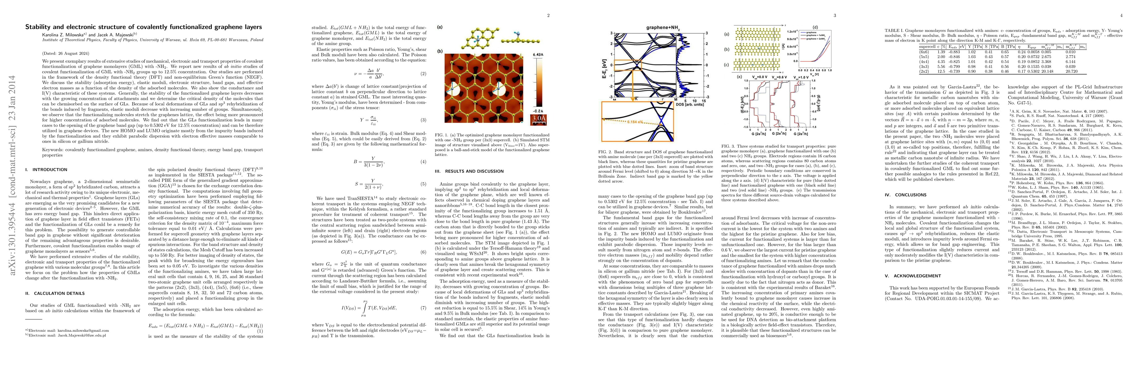 We present exemplary results of extensive studies of mechanical, electronic and transport properties of covalent functionalization of graphene monolayers (GML) with -NH2. We report new results of ab initio studies of covalent functionalization of GML with -NH2 groups up to 12.5% concentration. Our studies are performed in the framework of the density functional theory (DFT) and non-equilibrium Green's function (NEGF). We discuss the stability (adsorption energy), elastic moduli, electronic structure, band gaps, and effective electron masses as a function of the density of the adsorbed molecules. We also show the conductance and I(V) characteristic of these systems. Generally, the stability of the functionalized graphene layers decreases with the growing concentration of attachments and we determine the critical density of the molecules that can be chemisorbed on the surface of GLs. Because of local deformations of GLs and sp3 rehybridization of the bonds induced by fragments, elastic moduli decrease with increasing number of groups. Simultaneously, we observe that the functionalizing molecules stretch the graphenes lattice, the effect being more pronounced for higher concentration of adsorbed molecules. We find out that the GLs functionalization leads in many cases to the opening of the graphene band gap (up to 0.5302 eV for 12.5% concentration) and can be therefore utilized in graphene devices. The new HOMO and LUMO originate mostly from the impurity bands induced by the functionalization and they exhibit parabolic dispersion with electron effective masses comparable to ones in silicon or gallium nitride.