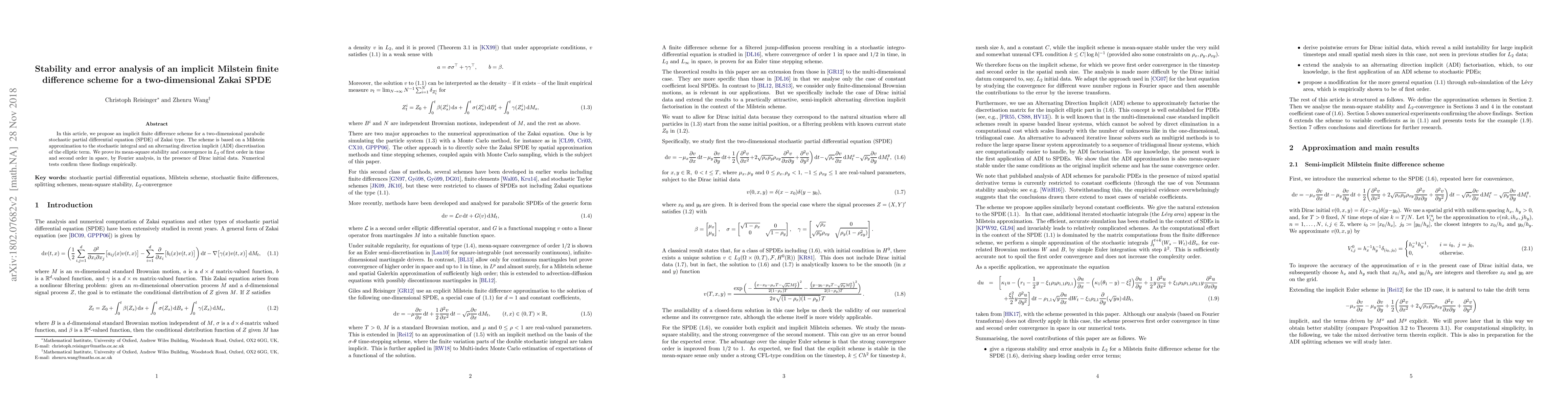 This paper proposes an implicit finite difference scheme for a two-dimensional Zakai SPDE, utilizing Milstein approximation and ADI discretization. It proves mean-square stability and first-order time, second-order space convergence, validated by numerical tests.