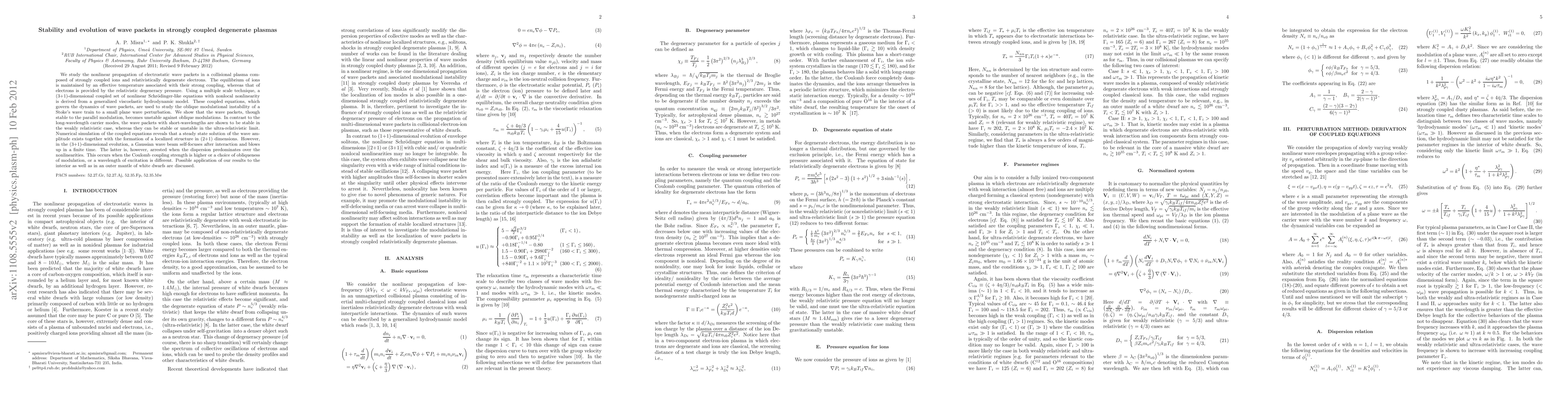 This paper investigates the nonlinear dynamics of electrostatic wave packets in strongly coupled, degenerate plasmas, deriving a set of nonlinear Schrödinger-like equations to model their evolution. It finds that while wave packets are stable to parallel modulation, they exhibit oblique modulational instability, with stability varying based on the relativistic nature of the electrons. Numerical simulations show localized wave structures and self-focusing, with finite-time blow-up mitigated by dispersion.