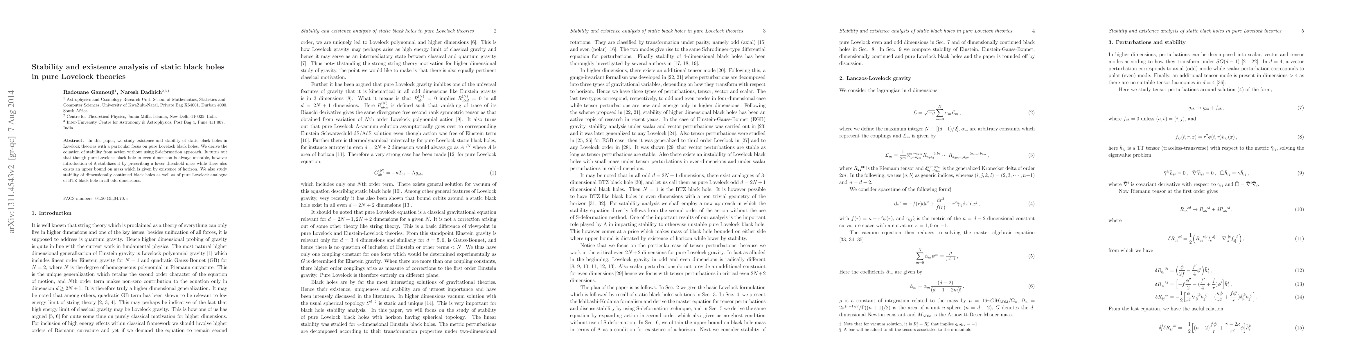 This paper examines the existence and stability of static black holes in pure Lovelock theories, revealing that pure-Lovelock black holes in even dimensions are unstable but can be stabilized by a cosmological constant, which sets a minimum mass threshold. It also investigates the stability of dimensionally continued black holes and pure Lovelock analogues of BTZ black holes in odd dimensions.