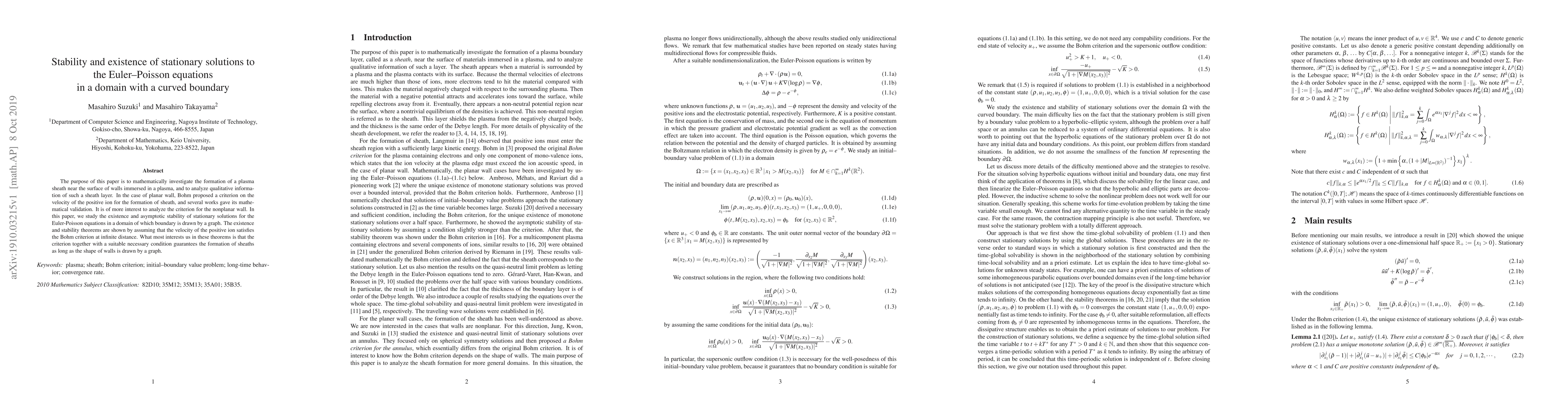 The purpose of this paper is to mathematically investigate the formation of a plasma sheath near the surface of walls immersed in a plasma, and to analyze qualitative information of such a sheath layer. In the case of planar wall, Bohm proposed a criterion on the velocity of the positive ion for the formation of sheath, and several works gave its mathematical validation. It is of more interest to analyze the criterion for the nonplanar wall. In this paper, we study the existence and asymptotic stability of stationary solutions for the Euler-Poisson equations in a domain of which boundary is drawn by a graph. The existence and stability theorems are shown by assuming that the velocity of the positive ion satisfies the Bohm criterion at infinite distance. What most interests us in these theorems is that the criterion together with a suitable necessary condition guarantees the formation of sheaths as long as the shape of walls is drawn by a graph.
