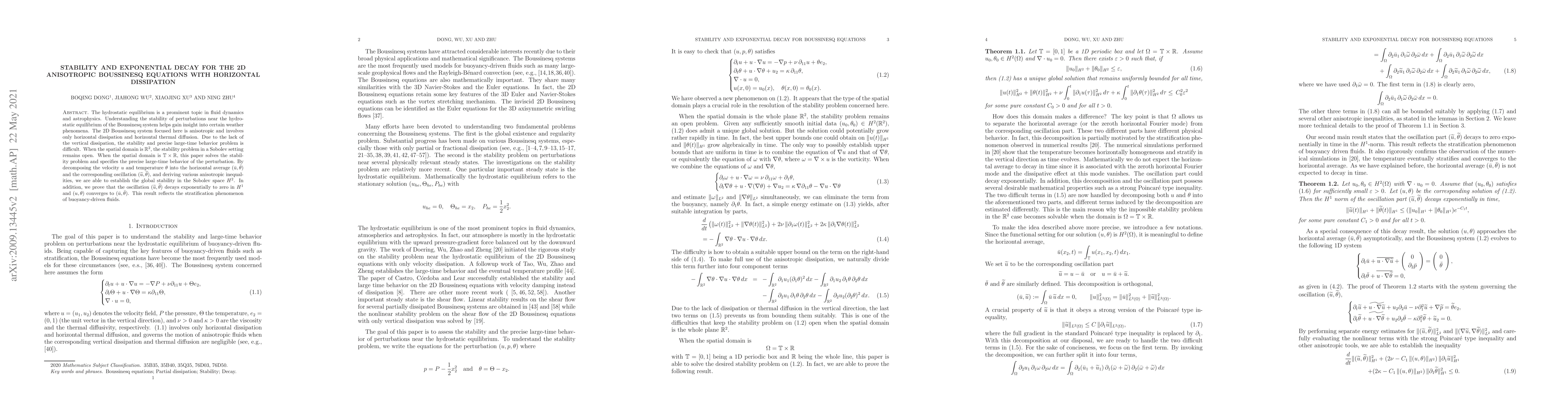 The hydrostatic equilibrium is a prominent topic in fluid dynamics and astrophysics. Understanding the stability of perturbations near the hydrostatic equilibrium of the Boussinesq systems helps gain insight into certain weather phenomena. The 2D Boussinesq system focused here is anisotropic and involves only horizontal dissipation and horizontal thermal diffusion. Due to the lack of the vertical dissipation, the stability and precise large-time behavior problem is difficult. When the spatial domain is $\mathbb R^2$, the stability problem in a Sobolev setting remains open. When the spatial domain is $\mathbb T\times \mathbb R$, this paper solves the stability problem and specifies the precise large-time behavior of the perturbation. By decomposing the velocity $u$ and temperature $\theta$ into the horizontal average $(\bar u, \bar\theta)$ and the corresponding oscillation $(\widetilde u, \widetilde \theta)$, and deriving various anisotropic inequalities, we are able to establish the global stability in the Sobolev space $H^2$. In addition, we prove that the oscillation $(\widetilde u, \widetilde \theta)$ decays exponentially to zero in $H^1$ and $(u, \theta)$ converges to $(\bar u, \bar\theta)$. This result reflects the stratification phenomenon of buoyancy-driven fluids.