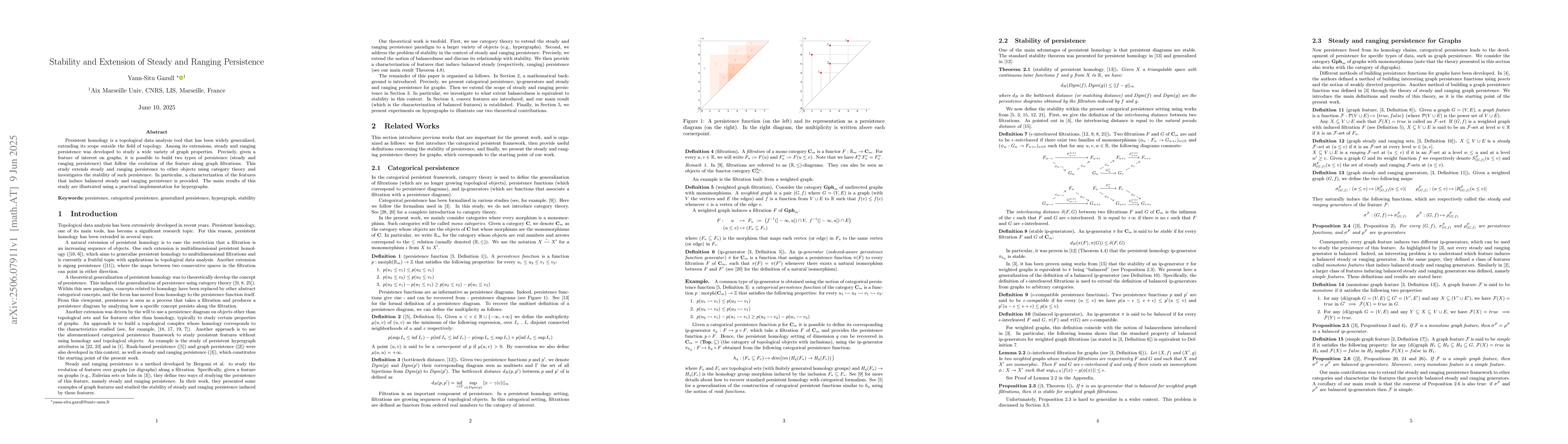 Persistent homology is a topological data analysis tool that has been widely generalized, extending its scope outside the field of topology. Among its extensions, steady and ranging persistence was developed to study a wide variety of graph properties. Precisely, given a feature of interest on graphs, it is possible to build two types of persistence (steady and ranging persistence) that follow the evolution of the feature along graph filtrations. This study extends steady and ranging persistence to other objects using category theory and investigates the stability of such persistence. In particular, a characterization of the features that induce balanced steady and ranging persistence is provided. The main results of this study are illustrated using a practical implementation for hypergraphs.